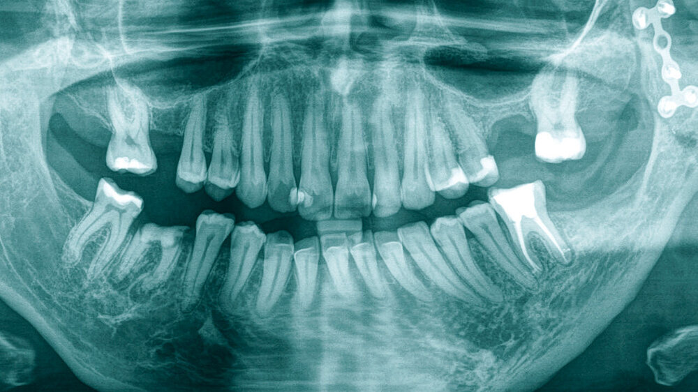 Radiologisch zeigten sich schon im Orthopantomogramm (Abbildung 1) eine deutliche Verschmälerung des gesamten linken Unterkieferbereichs und eine vormals eingebrachte Miniosteosyntheseplatte im Bereich des aufsteigenden Unterkieferastes.