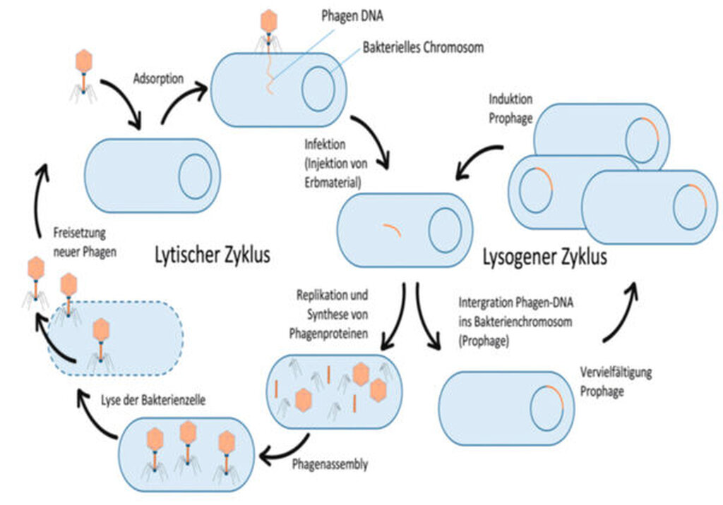 Im Unterschied dazu findet bei temperenten Phagen (lysogener Zyklus) nach der Infektion ein Einbau der genetischen Information ins Genom der Bakterienzelle statt (= Prophage). Die Phagen-DNA wird mit der des Bakteriums vervielfältigt. Eine Lyse der Zelle findet nicht statt (Abbildung 2). Durch exogene Stressoren wie Antibiotika, UV-Licht, pH-Änderung, toxische Substanzen, kann es zur Freisetzung (Induktion) der Prophagen kommen. Die Phagen-DNA wird aus dem bakteriellen Genom ausgeschnitten und der lytische Zyklus weiterverfolgt. Temperente Phagen sind für die Phagentherapie aus zwei Gründen wenig geeignet. Zum einen können sie die Bakterien nicht effektiv zerstören, zum anderen besteht bei der Induktion die Gefahr, dass versehentlich unerwünschte genetische Informationen des Wirtes mit ausgeschnitten und nachfolgend auf andere Bakterien übertragen werden (Transduktion / Horizontaler Gentransfer) [Zinder, 1952].