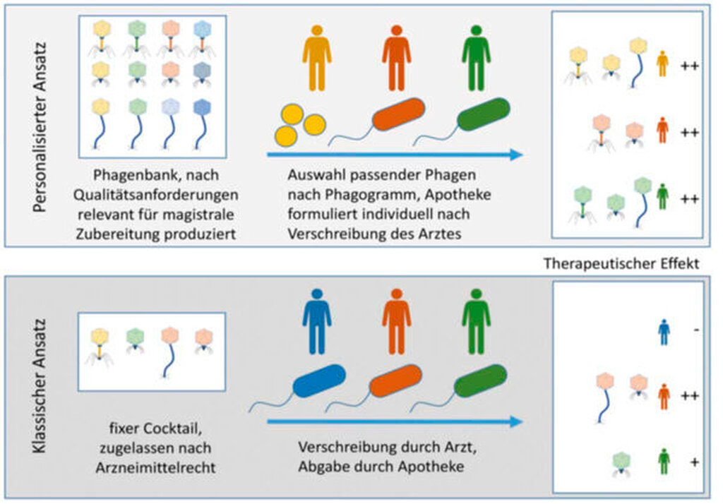 Neben der nach westlichen Ansprüchen wissenschaftlich bestätigten Wirksamkeit der Phagentherapie fehlt es bisher auch an Regularien für die Herstellung, Reinheitsanforderungen und Zulassung, die an die Bedürfnisse der Phagentherapie angepasst wurden. Zwei Herangehensweisen zur Umsetzung der Phagenanwendung kristallisieren sich heraus. Während für bestimmte Indikationen fixe Cocktails entwickelt werden (etwa Phage4Cure, BiomX, Armata Pharmaceuticals), wird auch ein personalisierter Ansatz verfolgt, bei dem die Phagen patientenindividuell zusammengestellt werden (zum Beispiel PhagoFlow, Magistral Phage – Belgien, Adaptive Phage Therapeutics) (Abbildung 4).