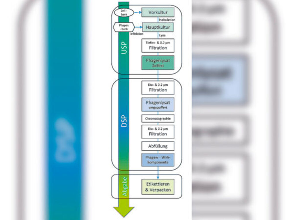 Inspiriert davon wurde 2019 das Projekt PhagoFlow zusammen vom Bundeswehrkrankenhaus Berlin, von Fraunhofer ITEM und der DSMZ, ermöglicht durch die Förderung des Innovationsfonds des Gemeinsamen Bundesausschuss (G-BA), gestartet. Ziel in diesem Projekt ist es, die infrastrukturellen Voraussetzungen für die magistrale Zubereitung von Phagen in Deutschland unter Beachtung der gesetzlichen Vorgaben zu überprüfen. Dabei sollen für klinisch relevante Bakterien wie P. aeruginosa, S. aureus und E. coli Phagen zur Therapie von Wundinfektionen an den Extremitäten zum Einsatz gebracht werden. Zunächst wurden geeignete Phagen-Wirtszell-Kombinationen von der DSMZ ausgewählt. Am Fraunhofer ITEM wird derzeit ein verfahrenstechnisch vereinfachtes Herstellungsverfahren entwickelt, das GMP-Anforderungen erfüllen muss, die für magistrale Zubereitungen notwendig sind. Die Vermehrung der Phagen erfolgt in Einwegkultivierungsbeuteln (USP = upstream prozessing), gefolgt von einer Aufarbeitungssequenz (DSP = downstream prozessing) zur Abtrennung von prozessbedingten Verunreinigungen (zum Beispiel Proteine, DNA und Membranbestandteile (Endotoxine) der Wirtsbakterien) (Abbildung 3). Vor der Abgabe der Phagen-Wirkkomponenten an den klinischen Partner erfolgt die Freigabeanalytik, die die Identitätsprüfung, die Quantifizierung und die Ermittlung des Bioburden (Gesamtkeimzahl) und des pH-Wertes umfasst, sowie die prozessbedingten Verunreinigungen adressiert. Noch in diesem Jahr sollen in der Klinikapotheke des Bundeswehrkrankenhauses Berlin erste magistrale Phagencocktails als Defekturarzneimittel für patientenspezifische Therapien formuliert werden. In Analogie zum Antibiogramm in der Antibiotikatherapie wird dazu in einem Phagogramm ermittelt, für welche Phagen das jeweilige Bakterienisolat eines Patienten empfindlich ist. Die Projektpartner rechnen mit neuen Erkenntnissen und Impulsen aus Phagoflow für qualitative Anforderungen an Phagenpräparate über den unmittelbaren Projektrahmen hinaus. Langfristiges Ziel ist es, die Integration der personalisierten Phagentherapie in den Klinikalltag zu ermöglichen [Dannheim, 2021].