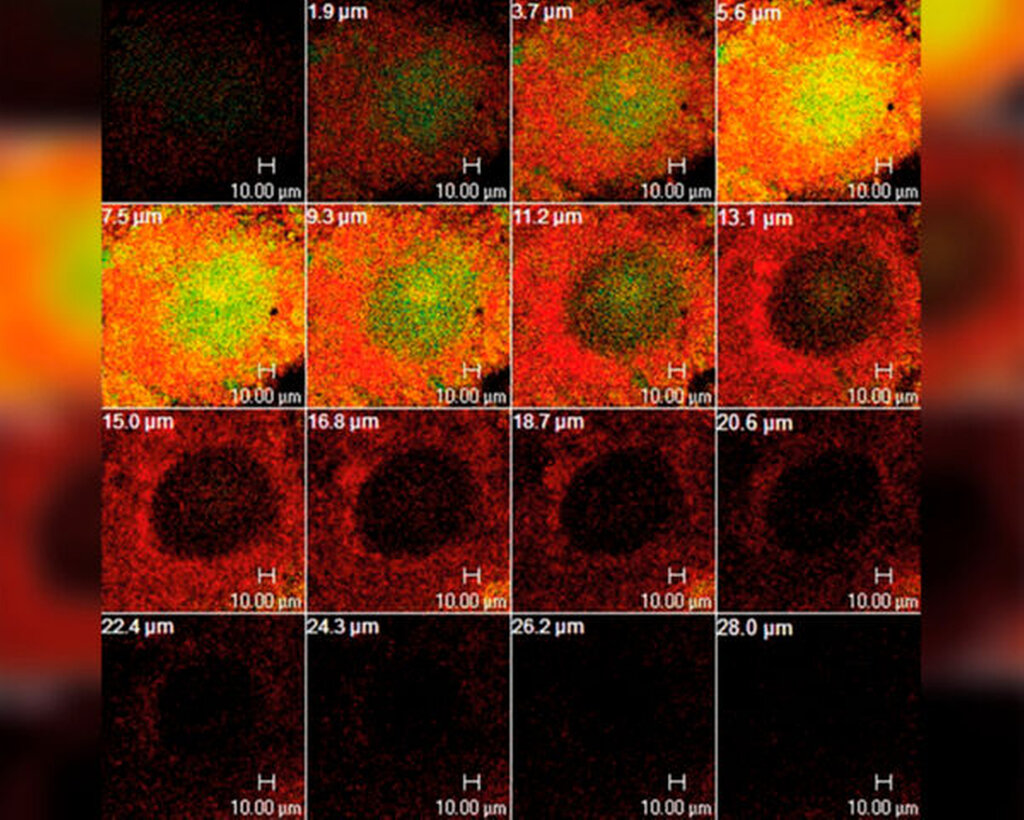 Diese eingeschränkte Wirksamkeit von CHX gegenüber oralen Biofilmen hat mehrere Ursachen: Zum einen kann die antibakterielle Wirkung von CHX durch Interaktion mit Speichel- oder Serumproteinen stark verringert werden [Abouassi et al., 2014]. Zum anderen wirkt die Biofilm-Matrix als Diffusionsbarriere für positiv geladene Moleküle wie CHX [Jakubovics et al., 2021]. Außerdem verändern Bakterien im Biofilm ihr Wachstumsverhalten und ihre Genexpression und werden dadurch weniger angreifbar und toleranter im Vergleich zu planktonischen Bakterien [Chambless et al., 2006]. Im oralen Biofilm führt daher die Behandlung mit CHX zu einem Konzentrationsgradienten mit hohen Konzentrationen an der Biofilmoberfläche und niedrigen in den unteren Schichten des Biofilms, was zu Arealen mit subinhibitorischen CHX-Konzentrationen führen kann [Jakubovics et al., 2021]. Diese eingeschränkte antibakterielle Wirkung von CHX in tieferen Schichten des Biofilms konnte bereits vielfach mithilfe der konfokalen Laser-Scanning-Mikroskopie (CLSM) in Kombination mit LIVE/DEAD-Färbung visualisiert werden [Zaura-Arite et al., 2001; Al-Ahmad et al., 2016]. Abbildung 3 zeigt exemplarisch eine CLSM-Aufnahme eines In-situ-Biofilms nach fünfminütiger Behandlung mit CHX, wo klar Bereiche mit subinhibitorischen Konzentrationen innerhalb des Biofilms gezeigt werden.