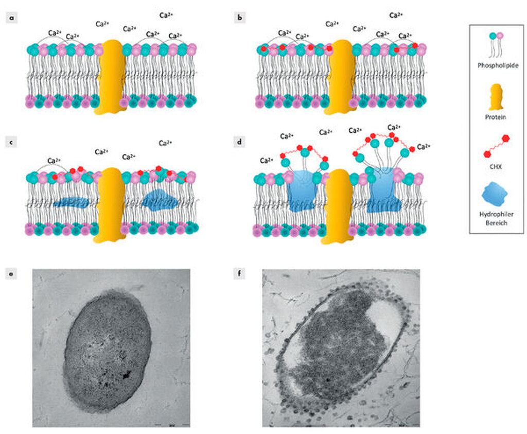 Die antibakterielle Wirkung von CHX wird gewöhnlich so beschrieben, dass es in niedrigen Konzentrationen bakteriostatisch und in höheren bakterizid wirkt [Jones, 1997]. Sein antibakterieller Wirkmechanismus beruht dabei auf einer Schädigung der bakteriellen Zytoplasmamembran und dem anschließenden Austritt von Zytoplasmabestandteilen [Gilbert & Moore, 2005; Cieplik et al., 2019; Muehler et al., 2020]. Abbildung 2 zeigt schematisch den Wirkmechanismus von CHX sowie transmissionselektronenmikroskopische Aufnahmen nach der Behandlung mit CHX, die die Effekte von CHX auf die bakterielle Zytoplasmamembran darstellen.