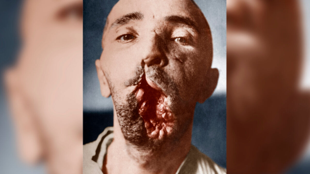 „[I]ch starre in ein kreisförmiges Loch von der Größe eines Handtellers, das von der Nasenwurzel bis zum Unterkiefer reicht. Das rechte Auge ist zerstört, das linke halb geschlossen. Während ich mit dem Mann rede, sehe ich das ganze Innere seiner Mundhöhle offen vor mir liegen: Kehlkopf, Speiseröhre, Luftröhre, wie bei einem anatomischen Präparat [...]. Aber was ist das für ein seltsam behaarter Fleischklumpen, der lose an ein paar Sehnen und Bändern wie ein Glockenklöppel in dem Hohlraum pendelt? Man erklärt es mir: eine verunglückte Nase [...]“ [Kuttner, 1920].