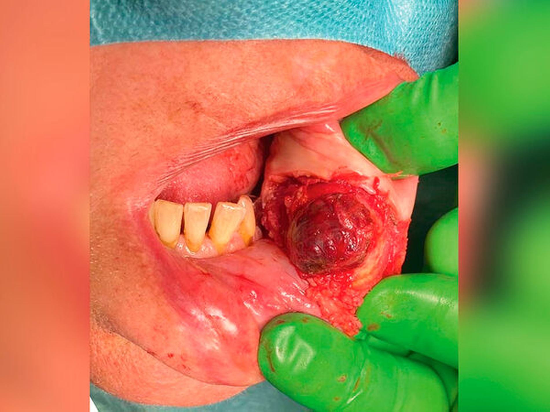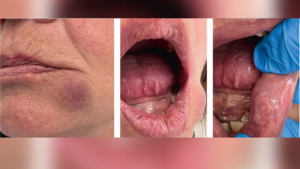 Klinisch tastete sich der Befund in der Unterlippe von intra- und extraoral bei einer Größe von circa 10 mm x 20 mm derb, wenig verschieblich gegen das umgebende Weichgewebe, indolent, nicht komprimierbar sowie ohne Anzeichen von Fluktuation oder Überwärmung. Extraoral imponierte die Raumforderung mit bläulich-lividem Hautkolorit (Abbildung 1). Die Sensomotorik war seitengleich intakt.