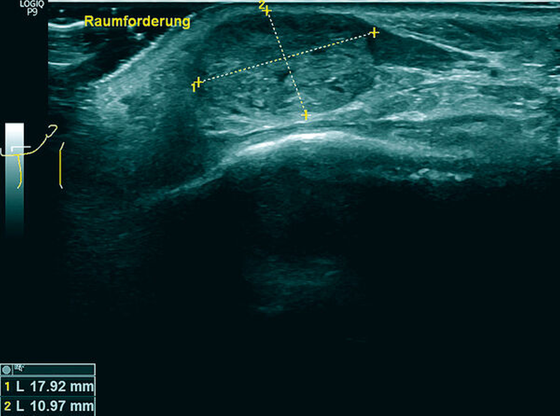 Eine am selben Tag durchgeführte sonografische Untersuchung des klinischen Befunds ergab eine ovaläre, homogen-echoreiche Schallantwort mit scharfer Begrenzung (Abbildung 2). Im zusätzlich durchgeführten Orthopantomogramm bildete sich die Raumforderung nicht ab.