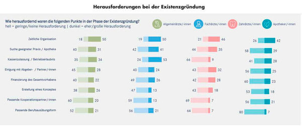 Befragt wurden insgesamt 800 Heilberufler aus den Bereichen Humanmedizin, Zahnmedizin und Pharmazie, die sich innerhalb der vergangenen zehn Jahre für oder gegen die Niederlassung entschieden haben. Demnach war für die 100 befragten Zahnärztinnen und Zahnärzte die zeitliche Organisation tatsächlich die größte Herausforderung im Gründungsprozess – dicht gefolgt von der Suche nach einer geeigneten Praxis und der Einigung mit dem Praxisabgeber oder -partner.