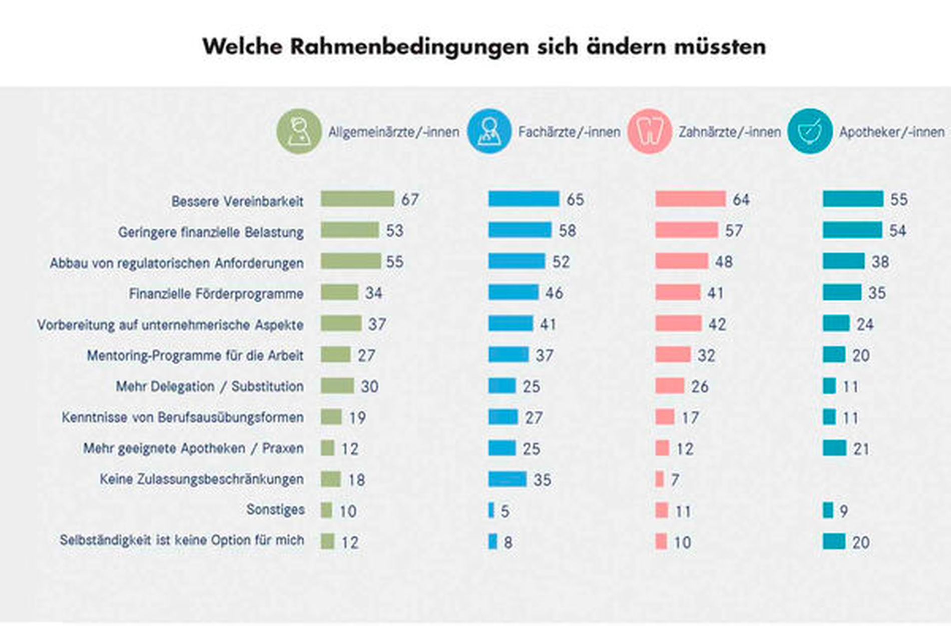 Um sich für die Selbstständigkeit zu entscheiden, müsste es laut den befragten Angestellten eine bessere Vereinbarkeit von Familie und Beruf (64 Prozent), eine geringere finanzielle Belastung (57 Prozent) sowie den Abbau von regulatorischen Anforderungen (48 Prozent) geben.