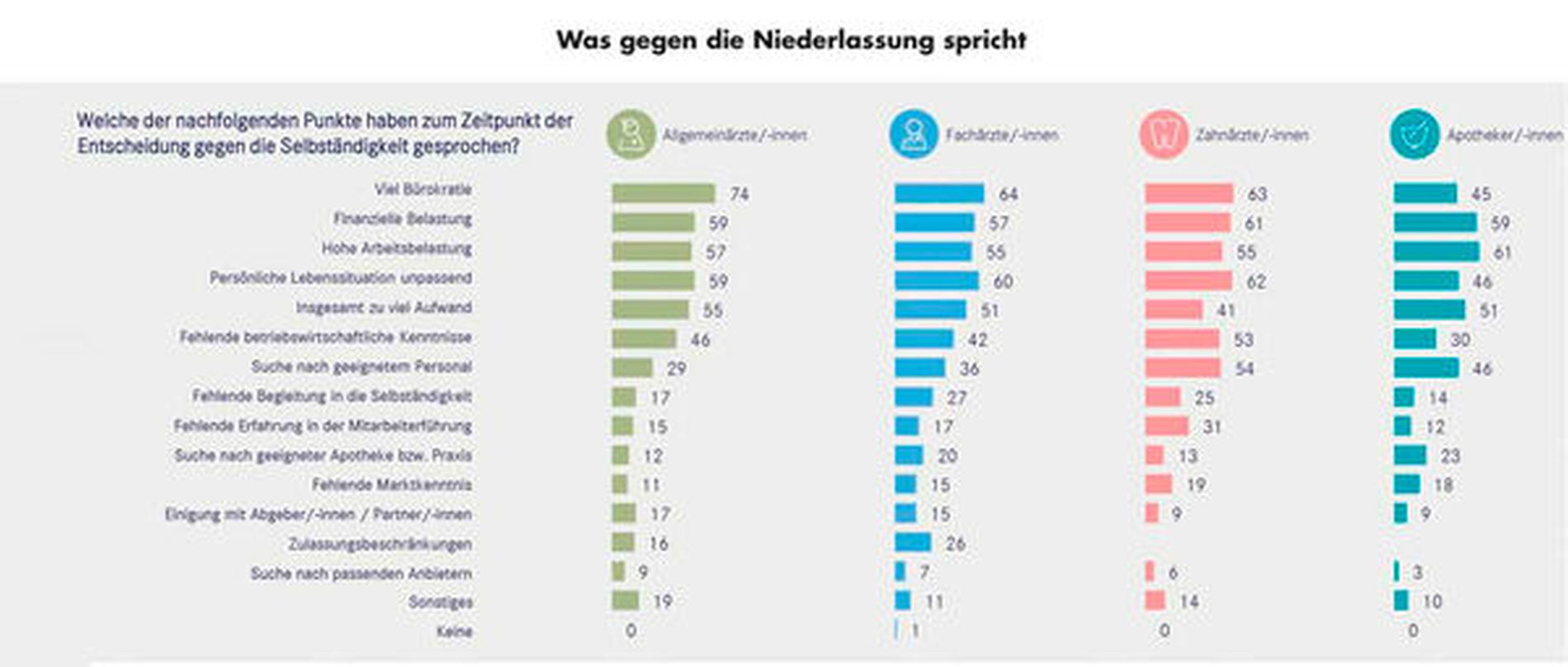 Im Umkehrschluss wurden 100 angestellte Zahnärztinnen und Zahnärzte befragt, was sie von der Selbstständigkeit abhält. Die am häufigsten genannten Vorbehalte sind zu viel Bürokratie (63 Prozent), die hohe finanzielle Belastung (61 Prozent) sowie die hohe Arbeitsbelastung (55 Prozent). Doch genauso häufig (62 Prozent) passt die Niederlassung einfach nicht zur persönlichen Lebenssituation. Jeder Zweite äußerte zudem Bedenken wegen fehlender betriebswirtschaftlicher Kenntnisse (53 Prozent) sowie der Suche nach geeignetem Personal (54 Prozent).