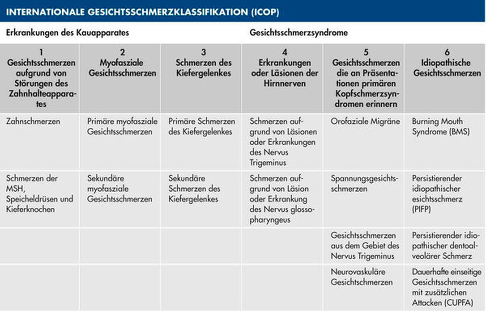 Gesichtsschmerzsyndrome werden laut ICOP in sechs Gruppen eingeteilt. Bei den Gruppen eins bis drei handelt es sich um Erkrankungen des Kauapparats mit 1. symptomatischen Schmerzen der Zähne und des Zahnhalteapparats, 2. myofaszialen Gesichtsschmerzen und 3. Kiefergelenkschmerzen. Diese Erkrankungen sind ZahnärztInnen vertraut, die Diagnosestellung ist eindeutiger und die Behandlung liegt im Spektrum der Zahn-, Mund-, Kieferheilkunde.