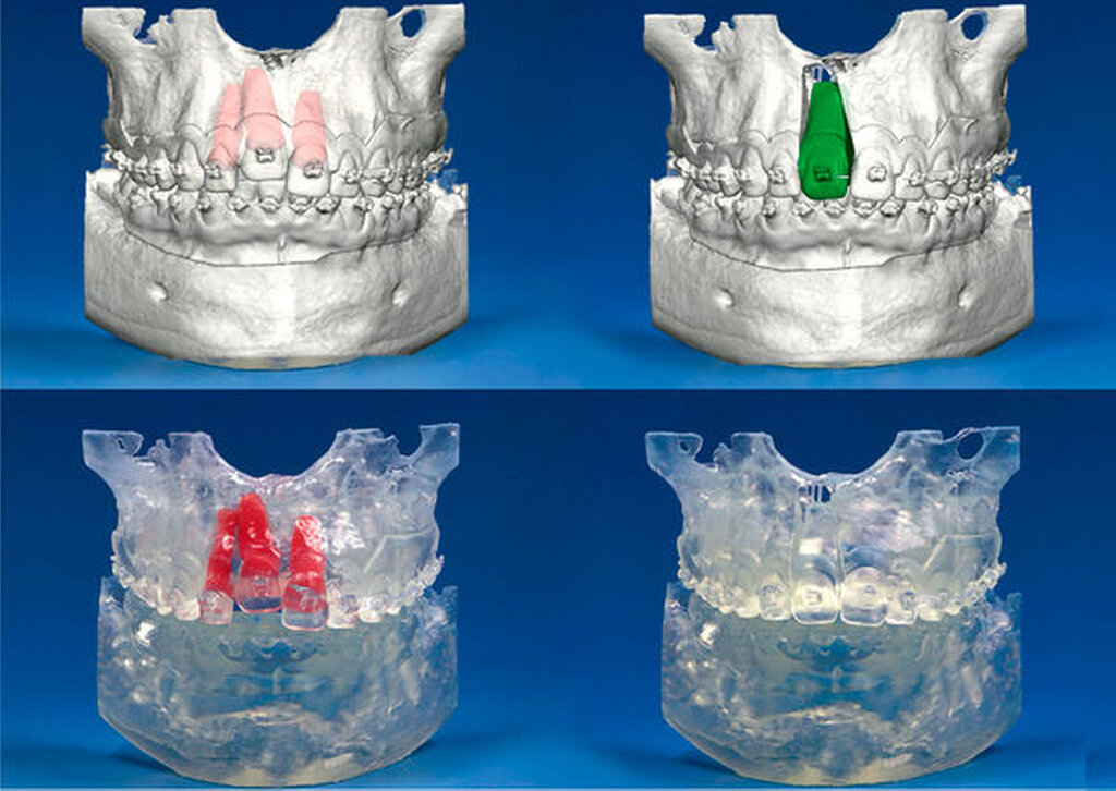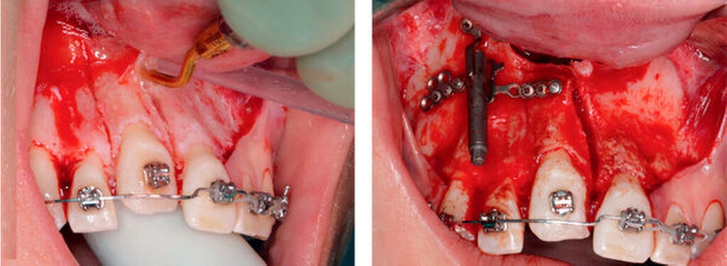 Im Rahmen der Operationsplanung stellte sich heraus, dass das univektoriale Distrahieren des Einzelzahnsegments aufgrund der Wurzelstellungen und der Form der Maxilla zu einem Versatz der Inzisalkante von circa 1,5 mm nach palatinal führen würde. Diese Abweichung ließ sich mit rein chirurgischen Mitteln nicht vorhersagbar beheben. Geplant wurde daher, diese zu erwartende Fehlpositionierung – in enger Zusammenarbeit zwischen Mund-, Kiefer- und Gesichtschirurgie sowie der behandelnden Kieferorthopädin – durch Ligatur des geklebten Brackets an den eingesetzten Stahlbogen zu kompensieren.