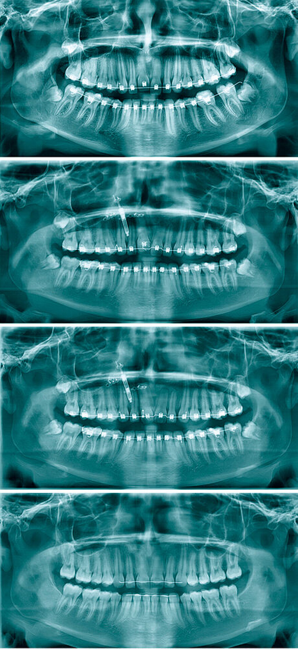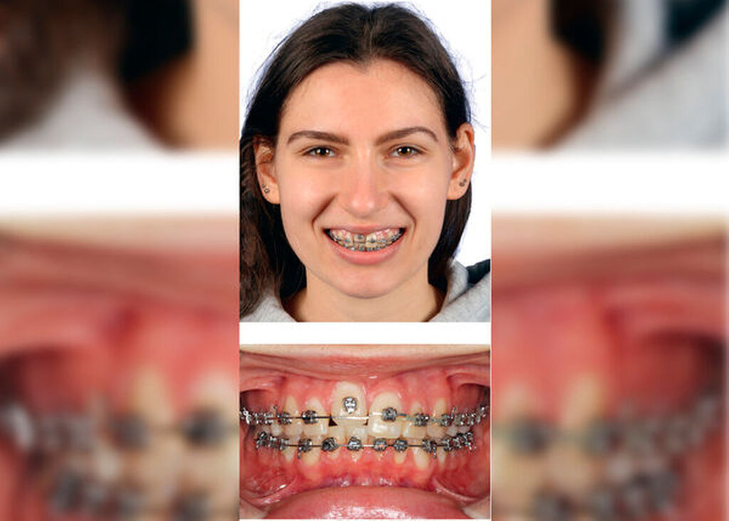 Vor dem kieferorthopädischen Behandlungsbeginn konnte eine Ankylose des Zahnes 11 klinisch und radiologisch weder sicher ausgeschlossen noch bestätigt werden. Die Patientin wurde nach differenzierter Befunderhebung und Diagnostik daher noch vor dem Beginn der Behandlung über die Möglichkeit der Ankylose des Zahnes 11 aufgeklärt und auf alle relevanten Therapiealternativen hingewiesen. Dann erfolgte die Behandlung mit einer festsitzenden Multibracketapparatur. Nach der Eingliederung fand zunächst die Nivellierung mittels thermoaktivierter Nitinol-Bögen statt. Unter engmaschiger Kontrolle der Nivellierung von 11 und insbesondere der Nachbarzähne 12 und 21 wurde klinisch die Diagnose einer Ankylose des Zahnes 11 gestellt. Der Zahn 11 wurde somit aus der Behandlung ausgenommen, zunächst wurden die restlichen Zähne sowie die Bisslage korrigiert.