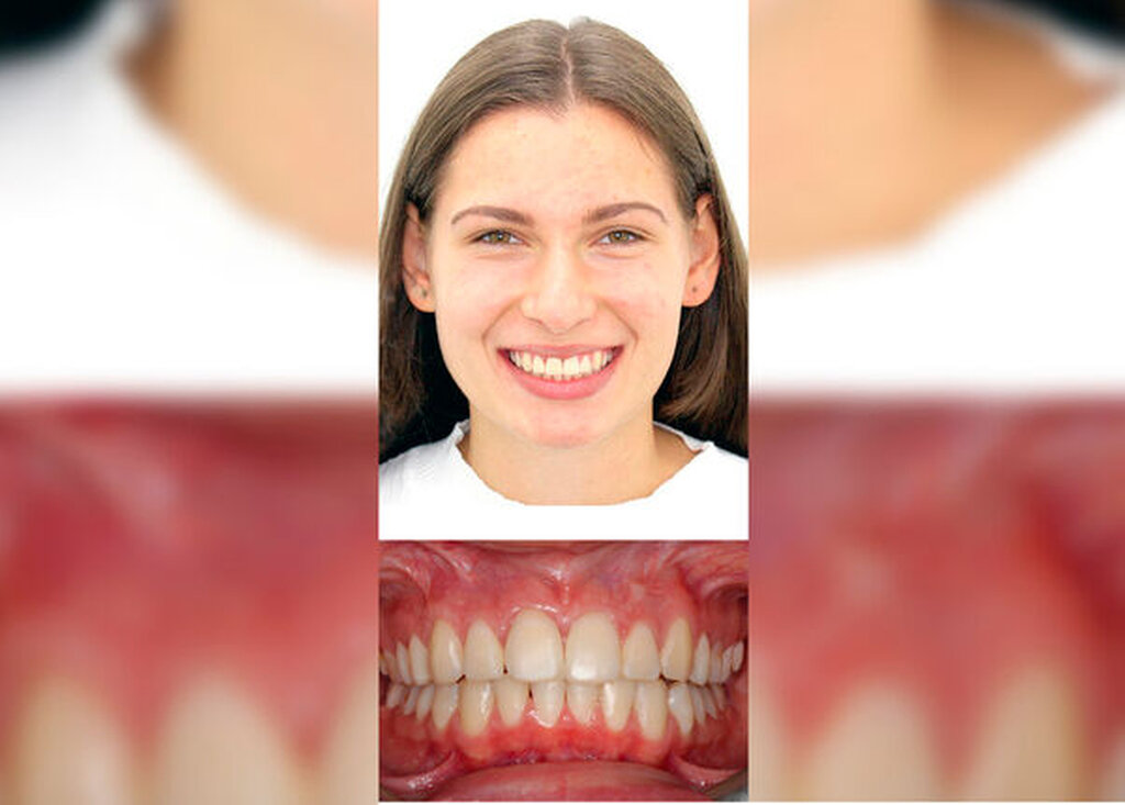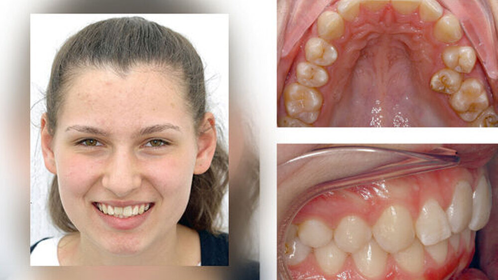 Die Patientin stellte sich im Alter von 16 Jahren mit dem Wunsch nach einem harmonischen Lächeln und gerade ausgerichteten Zähnen zur kieferorthopädischen Beratung bei ihrer Kieferorthopädin vor. Sie wies eine Distalbisslage von ¼ Pb Angle-Klasse II beidseits mit einem Steilstand der Oberkiefer-Frontzahngruppe auf. Es lag ein Platzverlust und Palatinalstand des Zahnes 25 vor (Abbildung 1). Aufgrund des Platzverlusts von 25 und dem damit einhergehenden asymmetrischen Kreuzbiss des Zahnes 25 sowie diversen Zahnfehlstellungen mit Dreh- und Kippständen, begleitet von einer verbesserungswürdigen Rot-Weiß-Ästhetik, war eine kieferorthopädische Behandlung funktionell indiziert.