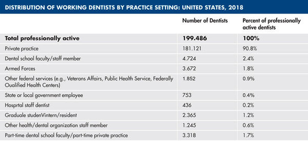 Über 750.000 Fachkräfte arbeiten in den USA in der Zahnmedizin – darunter mehr als 200.000 Zahnärzte, 221.560 Dentalhygieniker und 351.470 Zahnarzthelfer. Sie sind in privaten und öffentlichen Praxen tätig, in der akademischen Welt sowie in Bundes-, Landes- und Kommunalverwaltungen.
