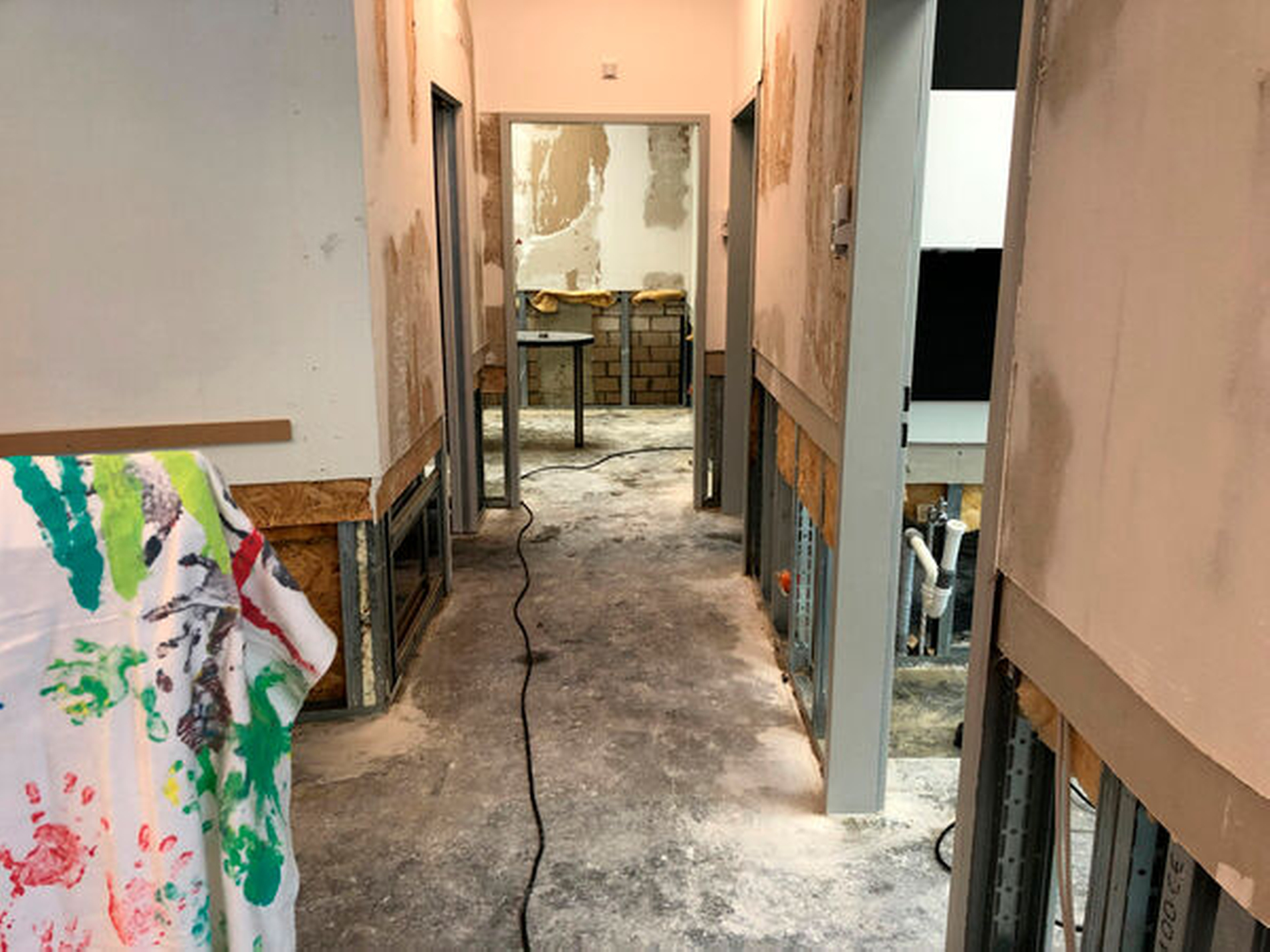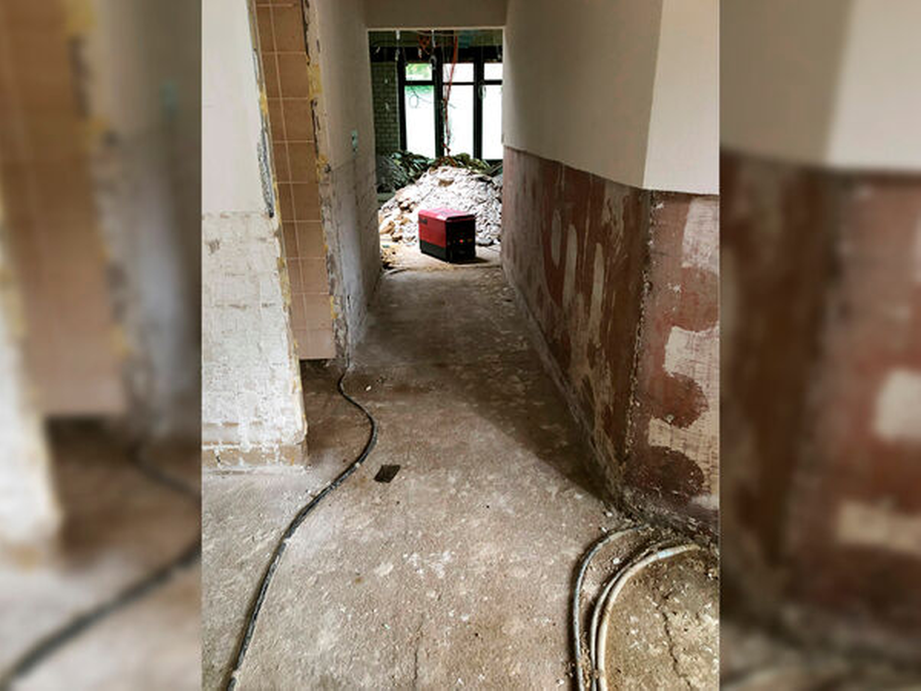 Das Ausmaß des Schadens im Wohn- und Praxisgebäude: Der gesamte Keller inklusive Lager war überflutet. Die erst im September 2020 eingerichteten Praxisräume im Erdgeschoss waren komplett zerstört: zwei Behandlungszimmer, Anmeldung, Warteraum, Büro, Backoffice, Sozialräume und Aufwachraum. Alle Trockenbauwände und der gesamte Estrich mussten entfernt werden, der Keller und das EG in den Rohbau zurückgebaut werden.
