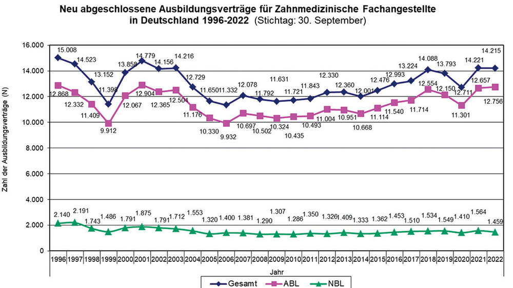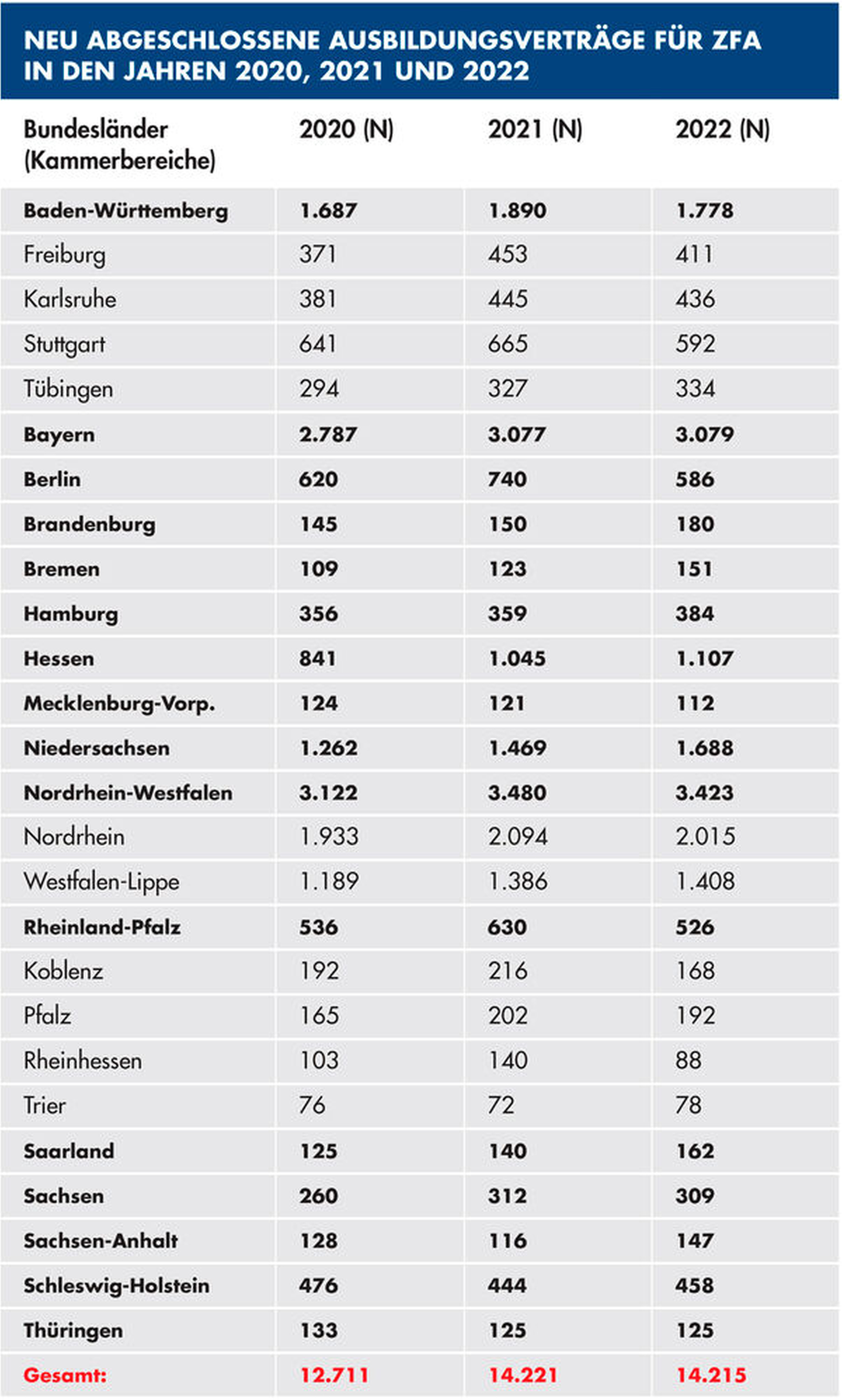 Im Jahr 2020 war die Zahl neu abgeschlossener Ausbildungsverträge für ZFA auf unter 13.000 eingebrochen, im Folgejahr dann wieder auf 14.221 gestiegen. Dieses Niveau konnte laut Bundeszahnärztekammer im Jahr 2022 gehalten werden (Abb. 1): Deutschlandweit wurden vom 1. Oktober 2021 bis zum 30. September 2022 insgesamt 14.215 Ausbildungsverträge für ZFA neu abgeschlossen (alte Bundesländer: 12.756; neue Bundesländer: 1.459). Gegenüber dem Vorjahr sind die Ausbildungszahlen damit im Durchschnitt leicht – um 0,04 Prozentpunkte – gesunken (alte Bundesländer: +0,78 Prozent; neue Bundesländer: -6,71 Prozent).