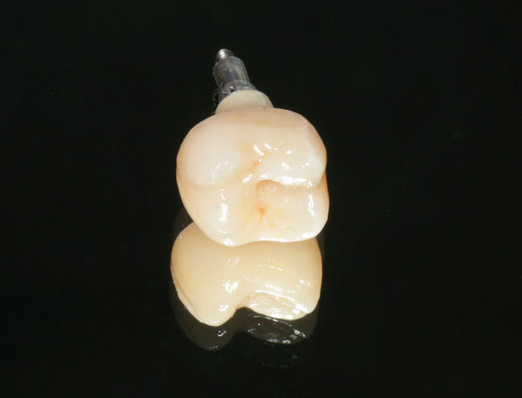 Im vorliegenden Patientenfall wurde sich bereits im Zuge der Implantatplanung (siehe auch den Abschnitt „Implantatpositionierung“) für eine transokklusal verschraubte Krone entschieden. Die Implantatkrone wurde im Hybridverfahren aus Lithiumdisilikat und der zugehörigen Titanklebebasis gefertigt (Abbildung 7). Entsprechend der Vorgabe des Implantatherstellers wurde die Krone mit einem Drehmoment von 20 Ncm eingeschraubt. Zu beachten ist, dass das Drehmoment sich zwischen den Herstellern und Implantattypen, aber auch den verwendeten Materialien des Dentallabors unterscheiden kann. Der transokklusale Schraubenkanal wurde abschließend mit Teflonband und Komposit verschlossen (Abbildungen 8 und 9). Bei auf Implantatabutments zementierten Kronen kann der Hohlraum zwischen der provisorischen Abdeckung des Schraubenkopfes und der definitiven Krone auch als Abflussreservoir für den Befestigungszement dienen. Hier entfällt der okklusale Verschluss mit Komposit.