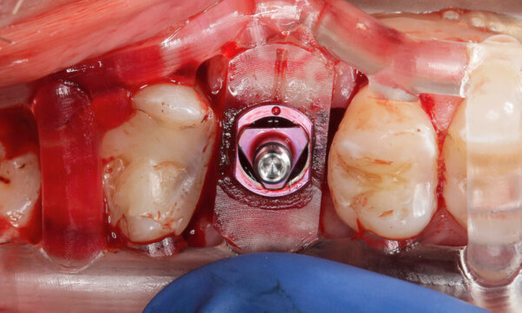 Die genaue Gestaltung der Bohrschablone ist abhängig vom Bohrprotokoll und der Führungsmethode des jeweiligen Implantatherstellers. Beim vorliegenden Patientenfall und Implantatsystem fanden die Aufbereitung des Implantatbetts und die Implantatinsertion durch eine in die Schablone eingeklebte Metallhülse statt (Abbildungen 4 und 5). Sowohl die Bohrer als auch die Einbringpfosten erreichen dabei einen definierten Tiefenstopp (Abbildung 4).