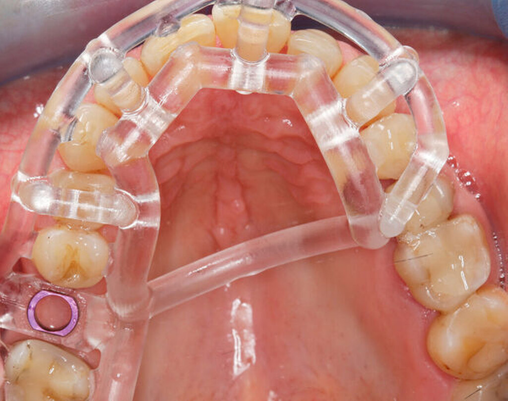 Im vorliegenden Patientenfall wurde die Implantation statisch navigiert mithilfe einer Bohrschablone und einer voll geführten Insertion durchgeführt (Abbildung 3). Dafür wurde der STL-Datensatz der Bohrschablone nach der Konstruktion in der IPS durch einen spezialisierten Mitarbeiter des Servicepartners DEDICAM (CAMLOG Vertriebs GmbH, Wimsheim) für die Bohrschablone zur Verfügung gestellt. Die Herstellung der Schablone erfolgte mithilfe eines 3-D-Druckers (Form 3, Formlabs GmbH, Berlin) im zahntechnischen Labor der Charité – Universitätsmedizin Berlin. Alternativ hierzu kann die Schablone auch vollständig fertig gestellt beim entsprechenden Anbieter bestellt werden.