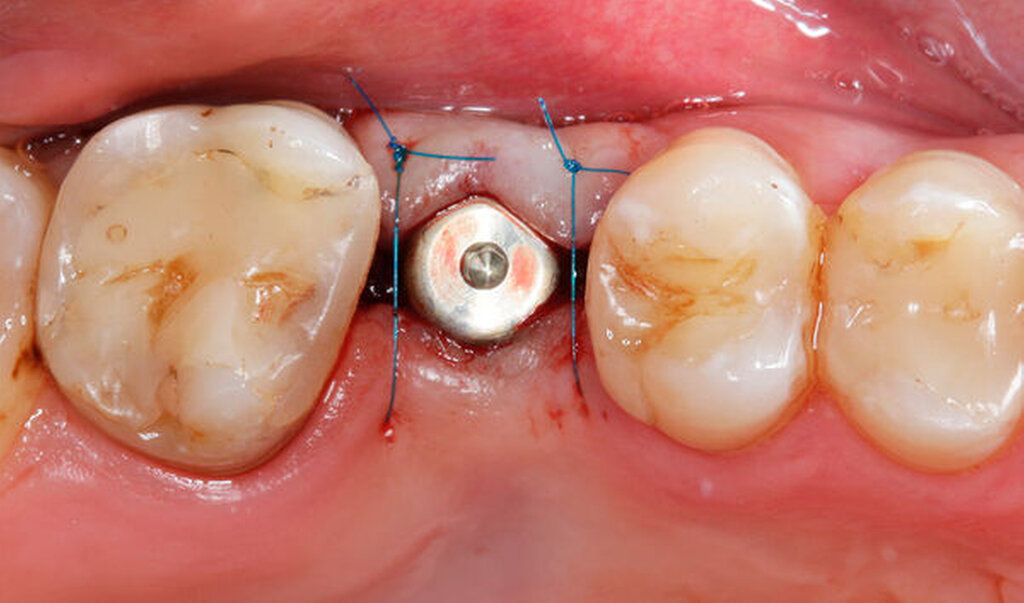 Im vorliegenden Patientenfall erfolgte die Freilegung drei Monate nach der Implantatinsertion mit einer leicht nach palatinal versetzten, krestalen Inzision in Ausdehnung bis zu den Nachbarzähnen. Dadurch wurde unter Verwendung eines konfektionierten Gingivaformers die Schleimhaut zur Verbesserung des vestibulären Defizits leicht nach bukkal verschoben. Die Fixation des Lappens erfolgte mit einer mesialen und einer distalen Einzelknopfnaht (Prolene 6–0, Ethicon Inc., Raritan, USA, Abbildung 6).