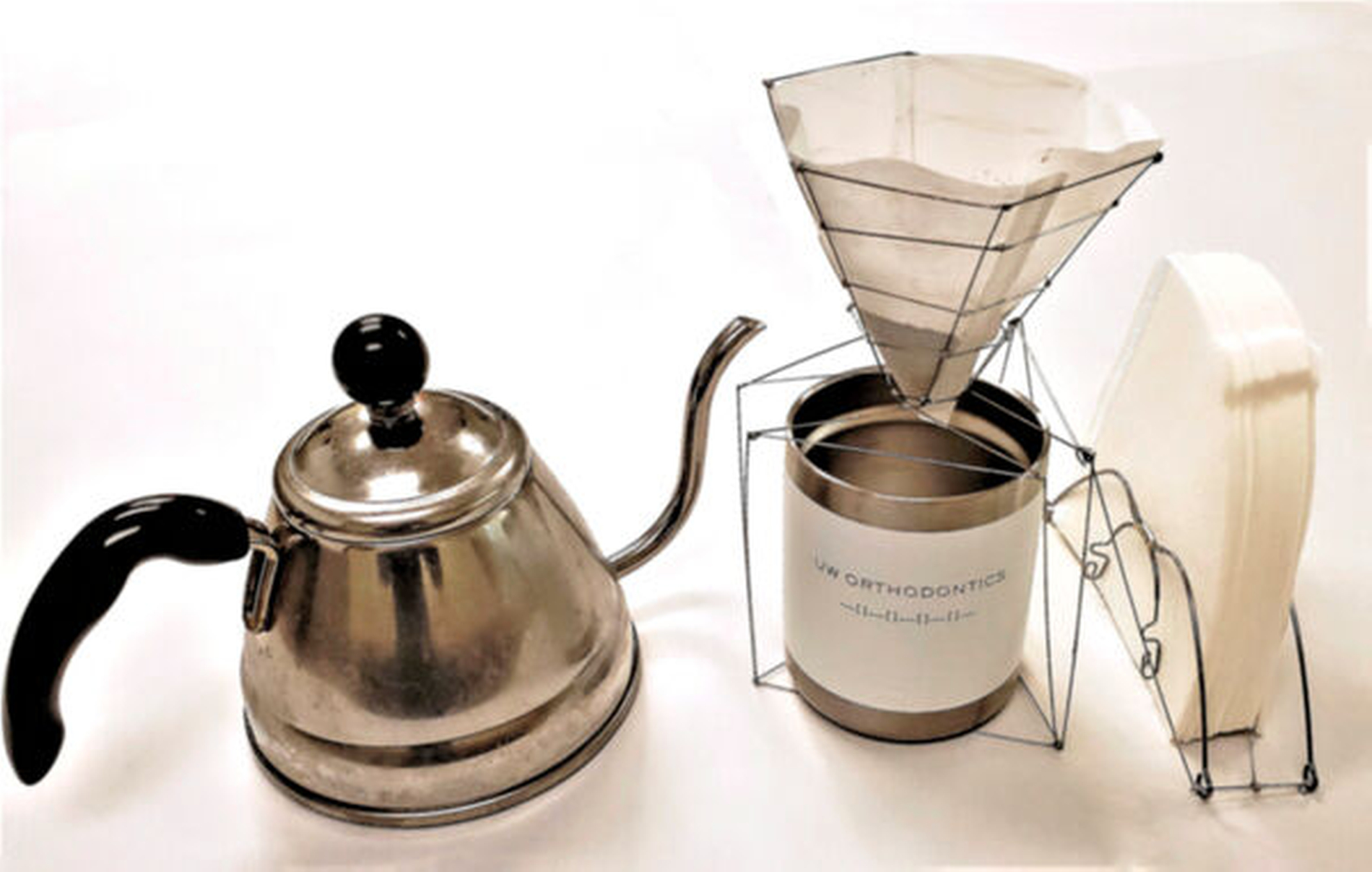 „Für meine Drahtskulptur wollte ich etwas schaffen, das sowohl ästhetisch ansprechend als auch funktionell ist – wie die Drähte, die wir für unsere Patienten biegen. Die aus gelöteten Orthodrähten gefertigte Kaffeemaschine wurde von einer meiner Lieblingsbeschäftigungen inspiriert – beim Zelten in der Wildnis morgens frisch gebrühten Kaffee zu trinken. Der Draht-Kaffeezubereiter ist extrem leicht und mit einem abnehmbaren Filterhalter eine wunderbare Möglichkeit, Kaffee mit Filter zuzubereiten – sowohl auf der Küchenarbeitsplatte als auch am Lagerfeuer.“