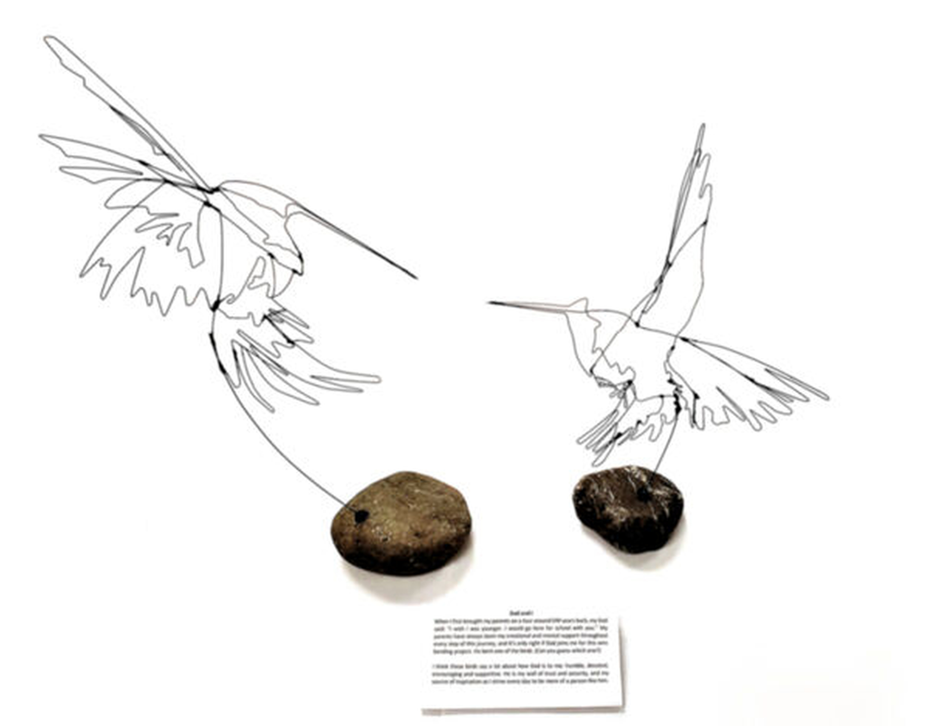 „Meine Eltern waren immer an jedem Schritt meines Weges beteiligt. Es ist daher nur richtig, dass ich meinen Vater in dieses Projekt einbeziehe, so versteht er ein bisschen mehr von dem, was ich tue und was mir jeden Tag Spaß macht. Ich habe die Vögel gezeichnet und er hat gelernt, die kieferorthopädischen Drähte zu biegen. Mein Vater hat einen der Kolibris gebogen. Sein Vogel sagt so viel über seine Persönlichkeit aus und darüber, wie er mir gegenüber ist: bescheiden, ermutigend, unterstützend und inspirierend. Kannst du erraten, welchen er gemacht hat?“