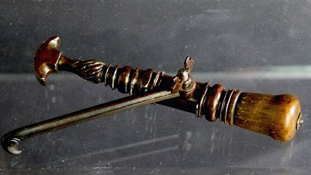 Der hier dargestellte Pelikan ist aus der Zeit um 1600 und gehört zur Gruppe der Endlosschraube. Er zählt zu den schönsten, die es weltweit gibt. Mithilfe des hölzernen Griffs konnte der Haken per Drehbewegung individuell eingestellt werden, je nach Größe des zu extrahierenden Zahns. Die Schraube ist eine der großen technischen Verbesserungen am Pelikan. Sehr gut sieht man an der Feststellschraube und am gedrehten Schaft des Widerlagers die künstlerische Gestaltung des Hakens. Das Exponat ist aus Eisen und Holz gefertigt und etwa 14 cm lang. Es zeugt von der hohen Qualität der Sammlung Proskauer/Witt.