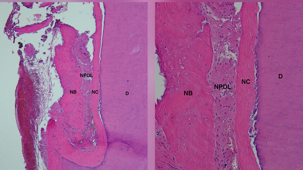 Idealerweise sollte diese Behandlung nicht nur zu klinischen Verbesserungen führen, sondern auch zu einem Defektverschluss durch parodontale Regeneration. Diese ist definiert als die Neubildung von Wurzelzement, Desmodont und Alveolarknochen an einer zuvor Plaque-exponierten Wurzeloberfläche in einer parodontalen Läsion (Abbildung 1).