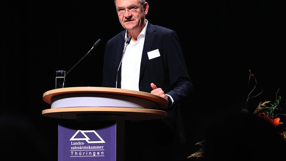 In seiner Begrüßungsrede machte Dr. Christian Junge, Präsident der Landeszahnärztekammer Thüringen, seinem Ärger über die aktuelle Gesundheitspolitik Luft: "Es ist unbegreiflich, wie ein Gesetzgeber die erst kürzlich zugesagten Mittel für die neue präventionsorientierte Parodontitistherapie in der gesetzlichen Krankenversicherung wieder entzieht.“