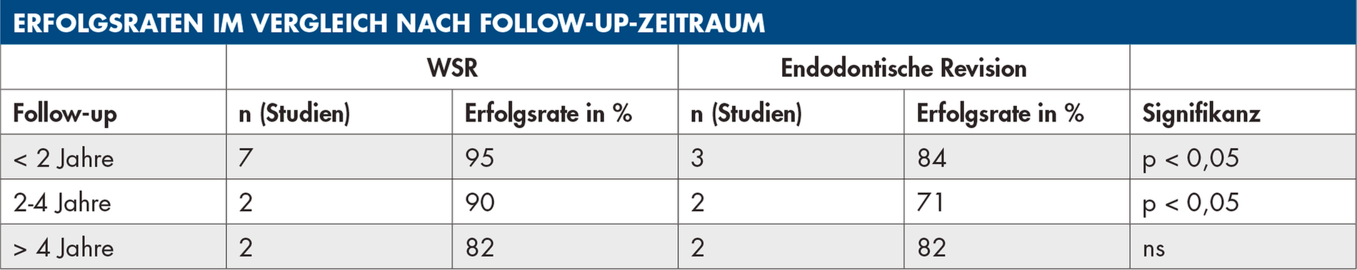 Vergleichbare Ausgangsbedingungen vorausgesetzt, ist nur der Vergleich WSR versus endodontische Revision möglich. Eine Metaanalyse von Kang et al. aus 2015 hat klinische Studien ausgewertet, die den Erfolg der endodontischen Revision und der WSR untersucht hatten.Die Erfolgsbeurteilung erfolgte zahnbezogen unter Berücksichtigung klinischer (Schmerz, Schwellung, Perkussionsempfindlichkeit, Fistel, Abszessgeschehen) und röntgenologischer Befunde (WSR-Gruppe: Einteilung nach Rud und Molven Gr. 1 und 2 vs. 3 und 4; Endorevision-Gruppe: Periapical Index PAI ≤ 2 vs. PAI ≥ 3). Dann wurden entsprechend der Nachbeobachtungsdauer drei Untergruppen gebildet, nämlich Studien mit einer Nachbeobachtungsdauer von bis zu zwei Jahren, von zwei bis vier und von über vier Jahren. Die Metaanalyse führte zu folgenden Ergebnissen: Bei kurzen Follow-ups schneidet die WSR mit einer Erfolgsrate von 95 Prozent signifikant besser ab als die endodontische Revision mit 84 Prozent. Bei den längeren Nachbeobachtungszeiträumen von zwei bis vier Jahren ist der Unterschied immer noch signifikant. Hier liegen die Werte bei 90 Prozent (WSR) und 71 Prozent (Endorevision). Nach vier Jahren sind die Ergebnisse nicht mehr signifikant verschieden. Hier liegen die Werte in beiden Gruppen bei 82 Prozent (Tabelle 2). Diese Ergebnisse wurden durch eine weitere Metaanalyse von Dioguardi et al. [2022] im Wesentlichen bestätigt.