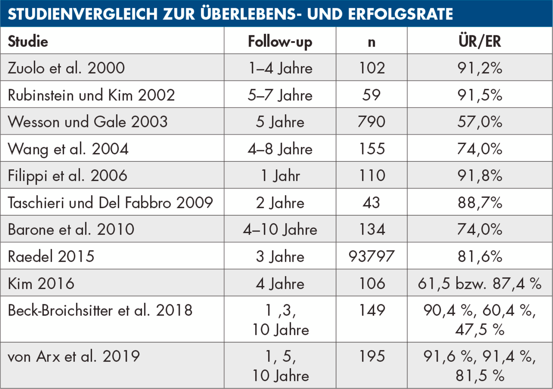 Bei einer retrospektiven Studie aus einer freien MKG-Praxis wurden retrospektiv Krankenblätter und Röntgenaufnahmen von 149 Behandlungsfällen analysiert, die in einem Fünfjahreszeitraum in der Praxis behandelt worden waren, und mit der Kaplan-Meier-Analyse eine Überlebensrate geschätzt. Die Autoren ermittelten Überlebensraten von 90,4, 60,4 und 48,3 Prozent nach einem, drei und zehn Jahren [Beck-Broichsitter et al., 2018].