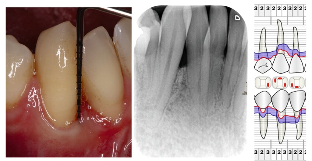 Die parodontale Regeneration ist eine gute Therapiemöglichkeit, um die Prognose von stark betroffenen Zähnen mit tiefen Resttaschen und Knochendefekten oder Furkationsdefekten zu verbessern. Der zusätzliche Nutzen für den Attachmentgewinn liegt bei durchschnittlich 1,34 mm und für die Reduktion der Sondierungstiefen bei 1,2 mm [Nibali et al., 2020]. Eine gute Plaquekontrolle wirkt sich dabei positiv auf das Heilungsergebnis aus und sollte deshalb die Basis für alle parodontalchirurgischen Maßnahmen sein [Rosling et al., 1976]. Auch Zähne mit Furkationsbefall sollten in die Parodontaltherapie einbezogen werden. Bei Furkationen von Unterkiefermolaren Grad II und Oberkiefermolaren mit bukkalem Furkationsbefund Grad II sollten regenerative parodontalchirurgische Maßnahmen in Betracht gezogen werden [Jepsen et al., 2020]. Zur Unterstützung der Regeneration von Knochentaschen oder Furkationsbefall Grad II stehen gut untersuchte Biomaterialien wie Membranen oder Schmelz-Matrix-Proteine mit oder ohne Zusatz von Knochenersatzmaterial zur Verfügung [Nibali et al., 2020]. Die Abbildungen 1 bis 3 zeigen einen Fall, bei dem durch eine regenerative Parodontalchirurgie die Prognose des Zahnes maßgeblich verbessert wurde.