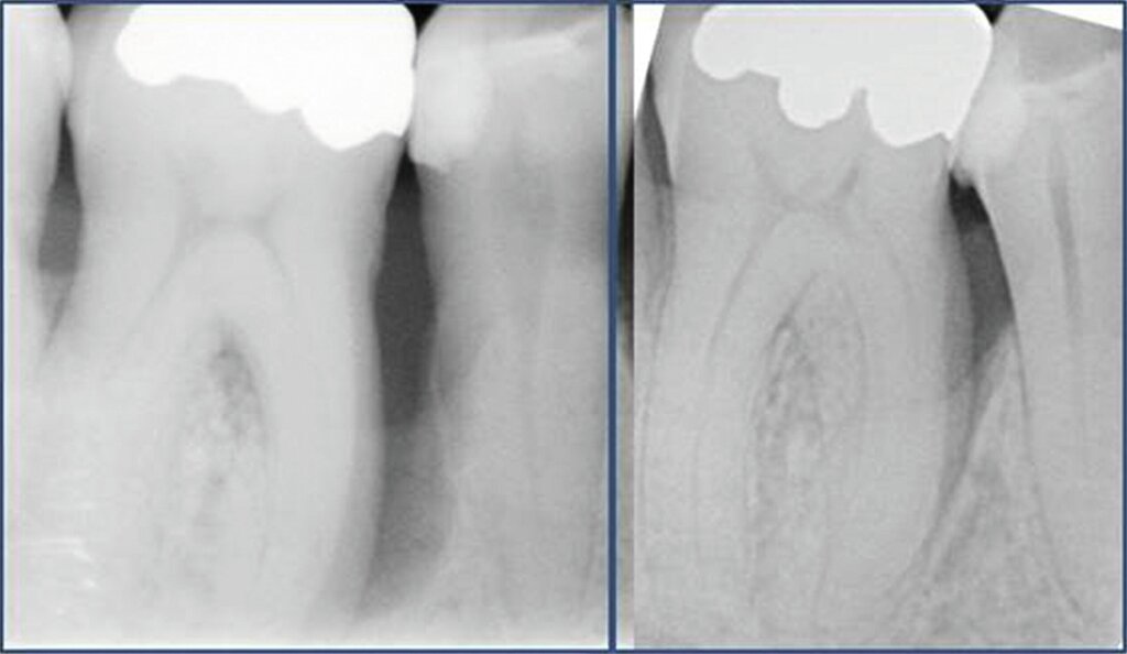 Mehrere Studien berichten über gute Langzeitergebnisse nach dieser Therapieform, insbesondere auch bei primär „hoffnungslos“ eingestuften Zähnen [Cortellini und Tonetti, 2004; Pretzl et al., 2009; Nygaard-Østby et al, 2010; Cortellini et al., 2020; Sculean et al., 2008]. In einer Studie von Cortellini et al. [2020] wurden 50 Patienten mit je einem „hoffnungslos“ prognostizierten Zahn (Knochenabbau ad apex) entweder der Testgruppe (regenerative Behandlung) oder der Kontrollgruppe (Extraktion mit Implantation durch festsitzenden Zahnersatz) zugeteilt. Die Überlebensraten nach zehn Jahren betrugen 88 Prozent für die Test- und 100 Prozent für die Kontrollgruppe. Die Kosten der Therapie waren in der Testgruppe signifikant geringer. Auch wenn die Ergebnisse beeindrucken, ist kritisch anzumerken, dass alle Patienten im Zeitraum von zehn Jahren vierteljährliche Recall-Sitzungen erhielten und die Therapie in einer hoch spezialisierten Praxis durchgeführt wurde. Das heißt, dass diese techniksensitive Therapie in einer allgemeinzahnärztlichen Praxis nicht unbedingt den gleichen Erfolg erzielen würde. Dennoch zeigt die Studie, dass auch bei schwer erkrankten Zähnen noch Regenerationspotenzial besteht und man sich auf die erste prognostische Einschätzung nicht einhundertprozentig verlassen kann. Auch mit nicht-chirurgischer Parodontitistherapie und konsequenter Erhaltungstherapie konnten in einer weiteren Studie 88,2 Prozent der primär als fraglich und 59,5 Prozent der primär als hoffnungslos eingestuften Zähne über einen Zeitraum von 15 Jahren erhalten werden [Graetz et al., 2011]. Dabei ist häufig ein beachtliches regeneratives Potenzial allein durch die nicht-chirurgische Parodontitistherapie festzustellen (Abbildung 4).