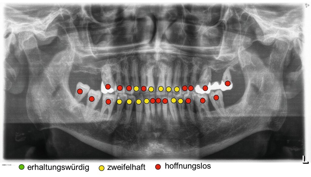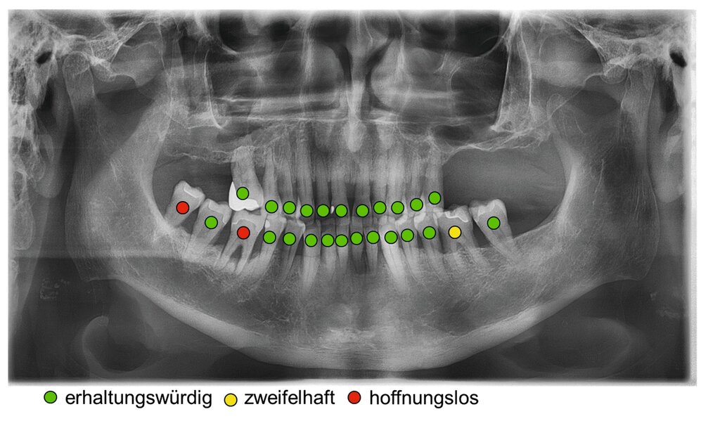 Natürlich sollte der dabei zu erhaltende Zahn die Patientinnen und Patienten nicht in ihrer Lebensqualität durch Schmerzen oder reduzierte Kaufunktion einschränken. Es sollte auch nicht leichtfertig auf stark parodontal vorgeschädigten Zähnen kostenintensiver Zahnersatz angefertigt werden. Wie aber dargestellt, lässt sich beispielsweise durch Immediatprothesen oder Langzeitprovisorien Zeit gewinnen, um eine aussagekräftigere Prognose zu erhalten.