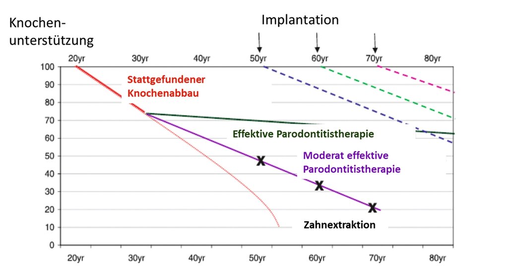Vor allem die Einbindung der Patienten in eine systematische und anschließend unterstützende Parodontitistherapie verbessert sowohl die Prognose von parodontal kompromittierten Zähnen als auch die von eventuell später inserierten Implantaten relevant. Allerdings scheint hierbei selbst bei adäquater Nachsorge der Knochenabbau um Zähne geringer zu sein als um Implantate – parodontale Komplikationen können dementsprechend bei Zähnen im Vergleich zu Implantaten als besser beherrschbar angesehen werden.