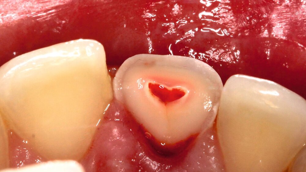 Eine Hämostase wurde durch Applikation von 1 Prozent NaOCl mithilfe von sterilen Schaumstoffpellets nach circa drei Minuten erreicht. Anschließend wurde die Pulpawunde mit einem Kalziumsilikatzement (Biodentine, Septodont, Saint-Maur-des-Fossés, Frankreich) überkappt. Nach zwölfminütiger Aushärtungszeit wurde die Kavität mit einem Sandstrahler gereinigt und für die adhäsive Versorgung vorbereitet. Abschließend wurde eine provisorische Kompositfüllung aus CeramX Duo A2 und CeramX Flow A2 (Dentsply Sirona, York, USA) mit Optibond FL (Kerr, Herzogenrath, Deutschland) in der Etch-and-Rinse-Technik gelegt.