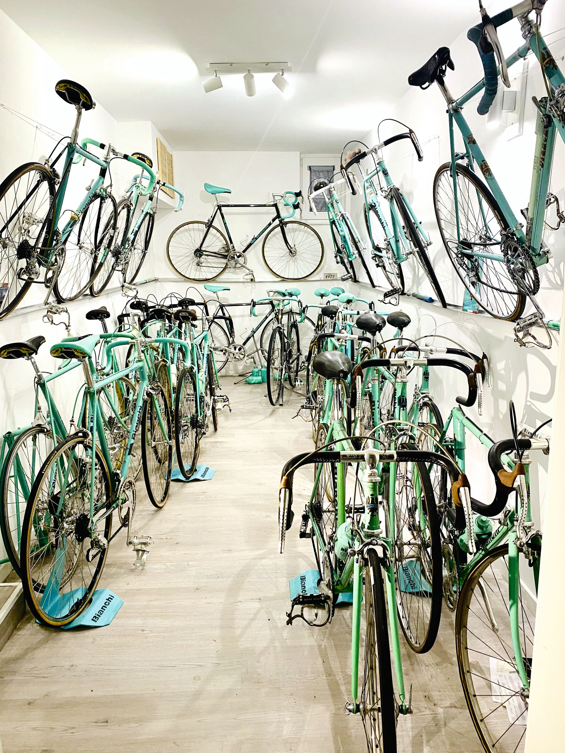 Das älteste Model ist von 1925, das jüngste von 1989, alle im klassischen Rahmendesign, alle – bis auf eine seltene schwarze Sonderedition – in der Bianchi-Kultfarbe „Celeste“ (übersetzt „himmlisch“) lackiert. Und bei nicht wenigen dieser grün-blauen Sportgeräte handelt es sich um die originalen Rennmaschinen legendärer Radsportgrößen, die bei der Tour de France oder dem Giro d‘ Italia zum Einsatz kamen. Die Sportler könne man anhand der Rahmennummern zuordnen, erklärt der Sammler, manchmal ist es auch für Laien sichtbar – etwa, wenn die Namen der Fahrer in die Sattelstützen eingraviert wurden.