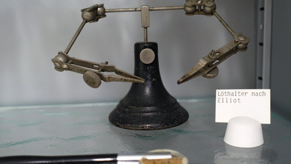 Die Ausstellungsvitrinen zeigen auch Gerätschaften zum Sockeln sowie Fixiervorrichtungen für Kiefermodelle zur Produktion von funktionskieferorthopädischen Instrumenten und eine Auswahl von historischen festsitzenden Apparaturen.