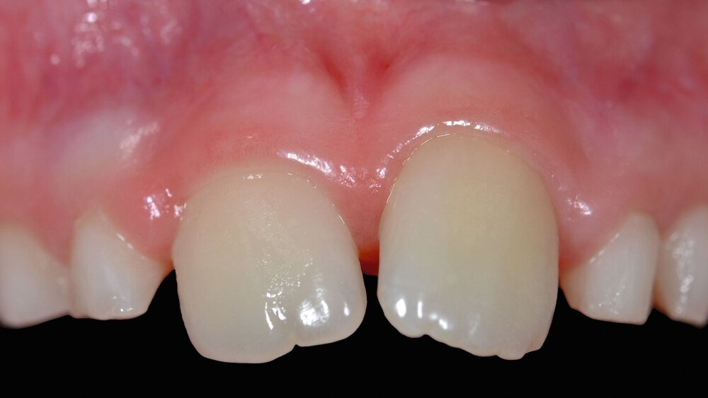 Zum Zeitpunkt des Beratungstermins lagen moderate, reizunabhängige Beschwerden sowie eine deutliche Perkussionsempfindlichkeit und keine Reaktion auf Kälte (— 40°C, Endo Coldspray, Henry Schein, Melville, USA) an Zahn 21 vor. Der horizontale Lockerungsgrad betrug I, die Sondierungstiefen lagen zirkulär bei 2 mm. Klinisch zeigte sich eine ausgeprägte Protrusion des Zahnes 21, die nach Schilderung der Eltern bereits vor dem Unfall vorgelegen hatte (Abbildung 1). Die Zähne 12, 11, 22 und 23 zeigten keine Auffälligkeiten und reagierten plausibel positiv auf Kälte. Zur weiteren Diagnostik wurden eine intraorale Aufnahme der Zähne 12-22 (Abbildung 2a) und eine Aufbissaufnahme (Abbildung 2b) der Frontzahnregion angefertigt. Auf beiden Röntgenbildern war deutlich eine Wurzelquerfraktur an Zahn 21 im mittleren Wurzeldrittel mit Dislokation zu sehen. Zusätzlich war im Vergleich zu Zahn 11 ein Unterschied im Wurzelreifungsgrad erkennbar. Auf Basis der röntgenologischen und der klinischen Befunde musste eine Pulpanekrose mit konsekutiver Entzündung des Parodontiums im Bereich des Bruchspalts als wahrscheinlich angenommen werden.