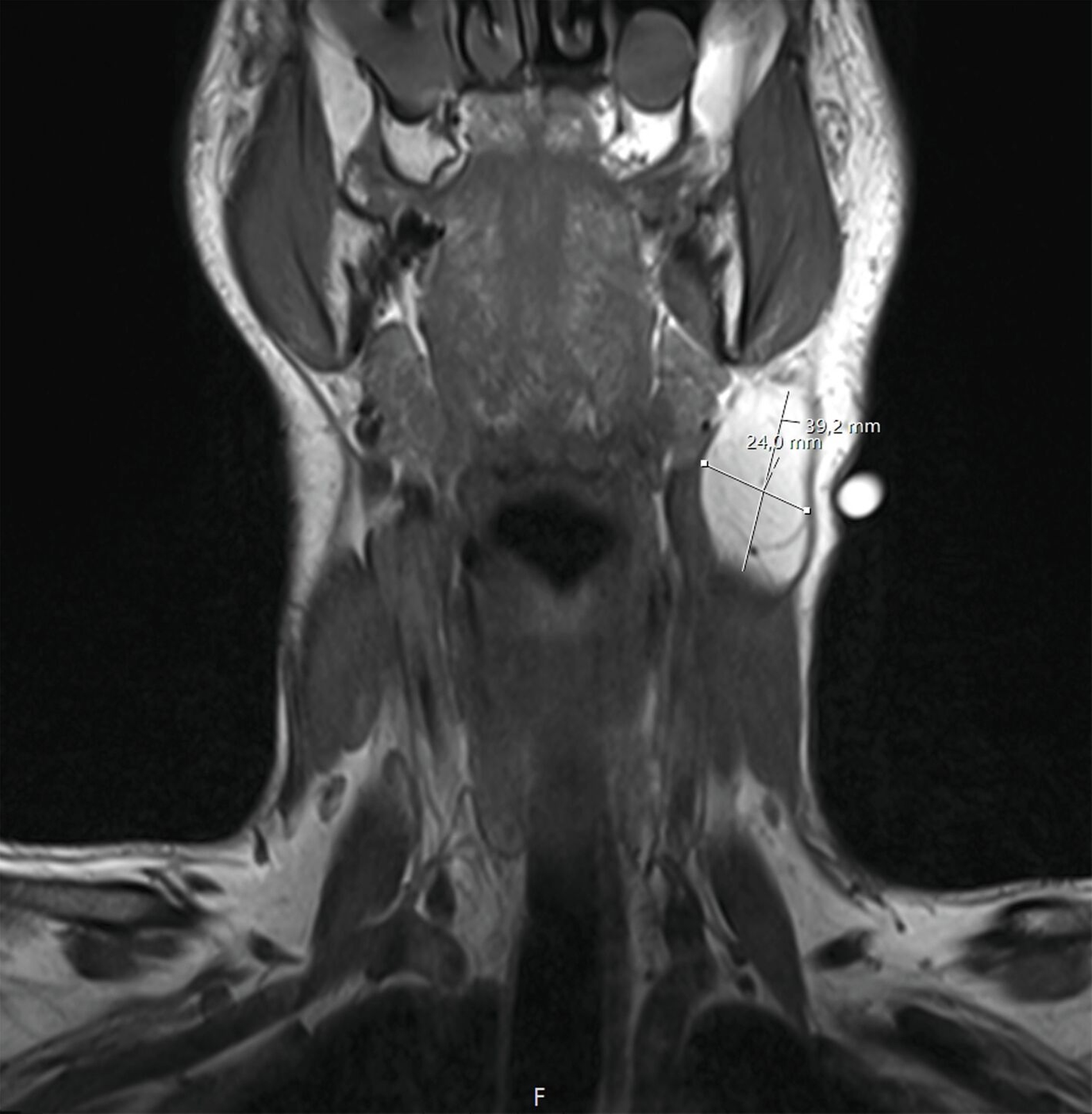 Bereits zum damaligen Zeitpunkt hatte der Patient einen niedergelassenen Kollegen mit der Bitte um Mitbeurteilung aufgesucht. Eine daraufhin angefertigte Magnetresonanztomografie zeigte einen circa 24 mm x 40 mm großen Befund im Bereich des mittleren Halsdreiecks, der keine Zeichen von Infiltration im Bereich der Gefäße oder der umgebenden Muskulatur aufwies (Abbildung 2).