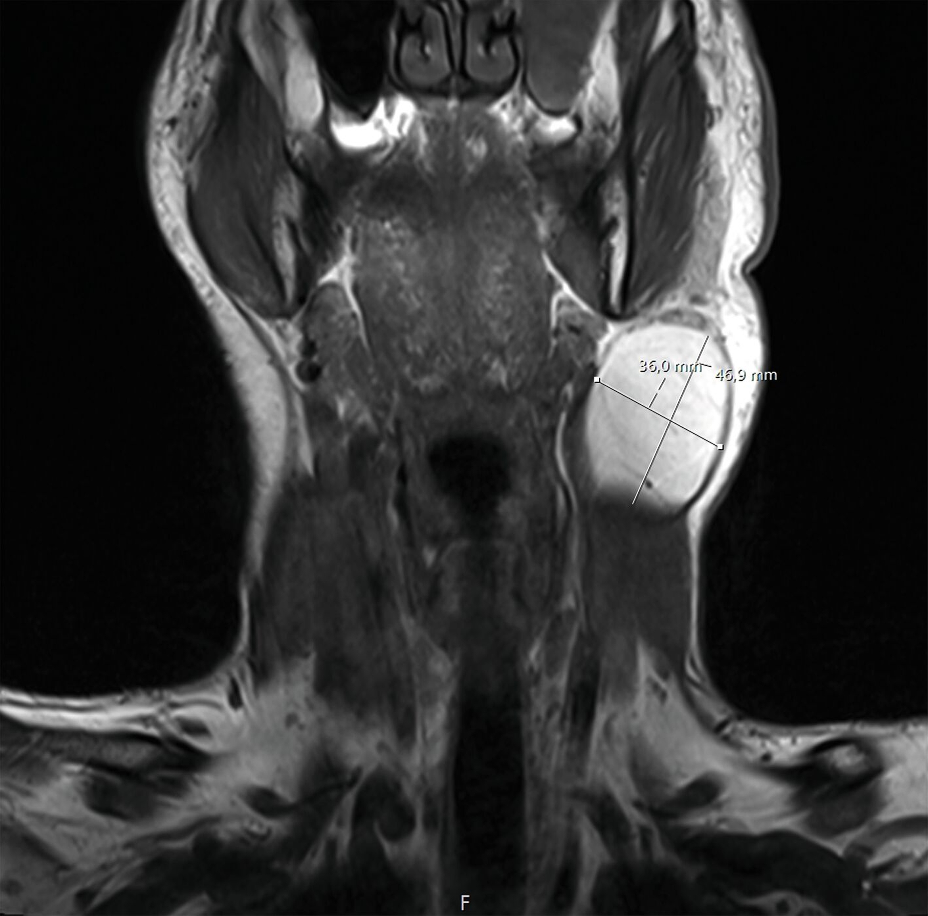 Eine radiologische Verlaufskontrolle mittels Magnetresonanztomografie brachte eine deutliche Volumenzunahme der bereits bekannten Raumforderung zur Darstellung. Es imponierte eine Größe von 36 mm x 47 mm in Kombination mit einer vorangeschrittenen Verdrängungstendenz im Bereich der zervikalen Muskulatur (Abbildung 3). Darauf folgte die Überweisung des Patienten zur weiteren Therapieübernahme.