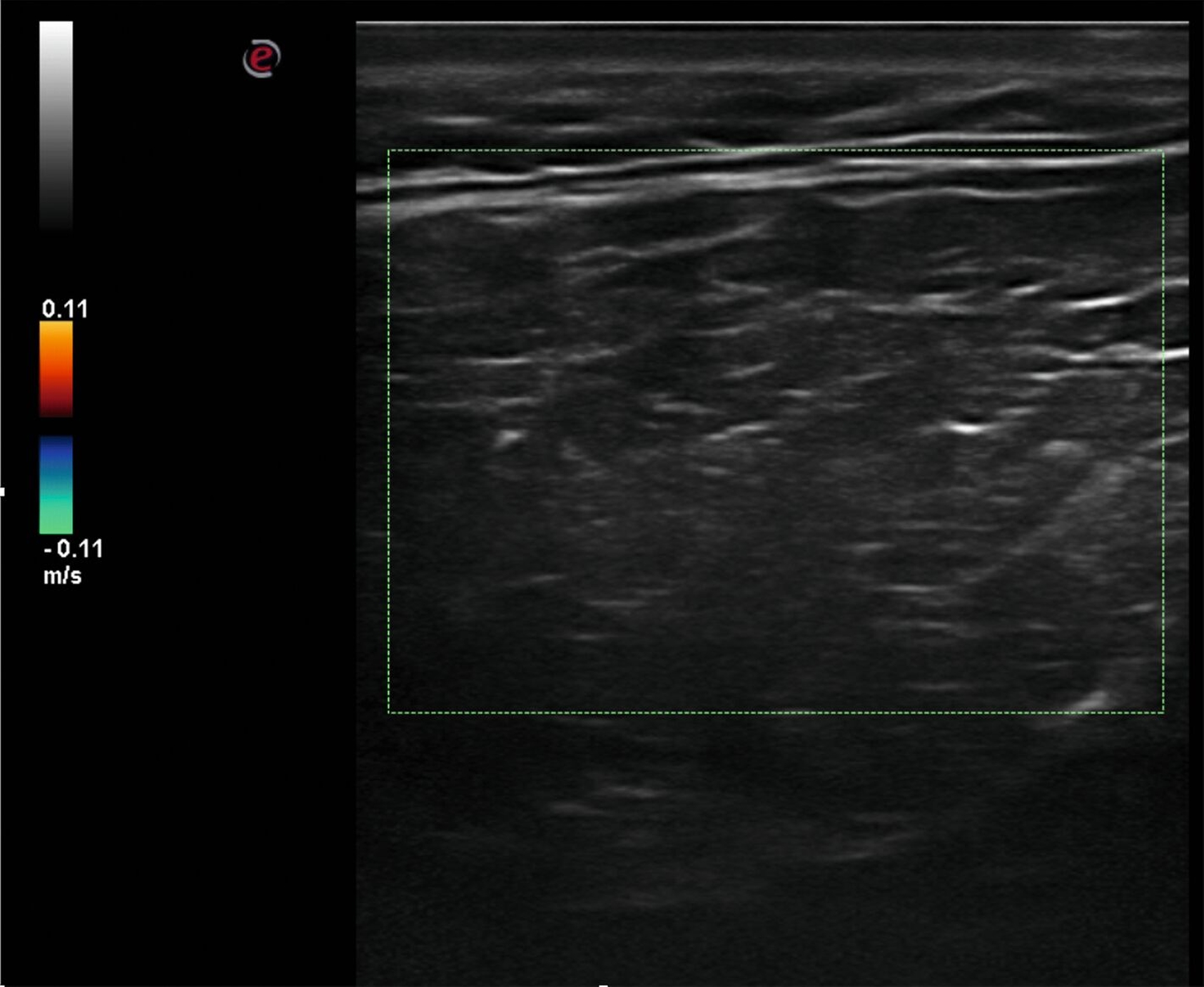 Die klinische Untersuchung zeigte einen verschieblichen, weichen und nicht druckdolenten Befund, der bereits zu einer sichtbaren Volumenzunahme der linken Halsseite geführt hatte (Abbildung 1). Zur erweiterten Diagnostik erfolgte eine Sonografie, in der sich ein Befund mit gefiedertem Binnenecho darstellen ließ (Abbildung 4). Malignitätszeichen fanden sich auch zu diesem Zeitpunkt weiterhin nicht. Es wurde die Verdachtsdiagnose eines Lipoms gestellt.