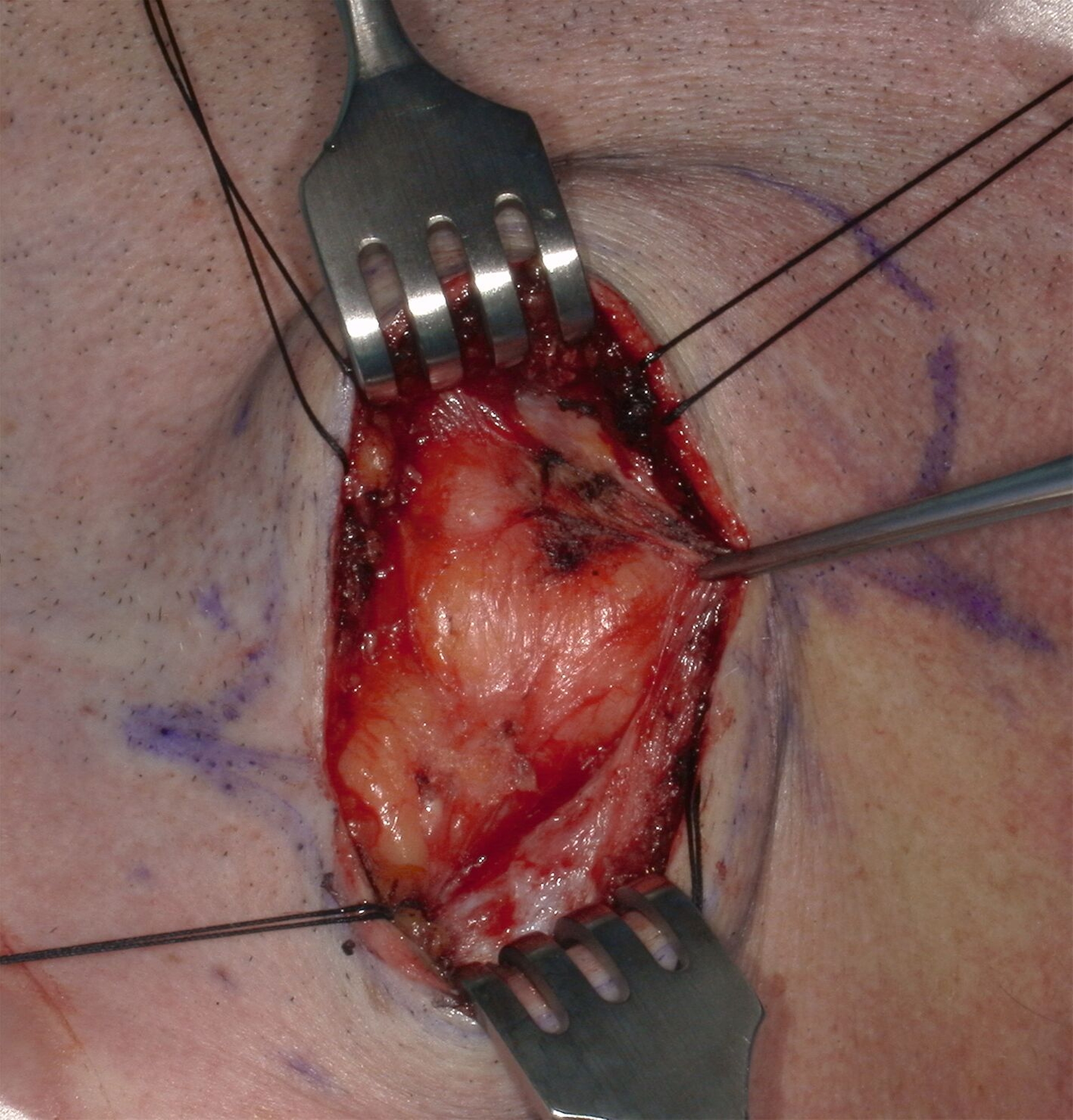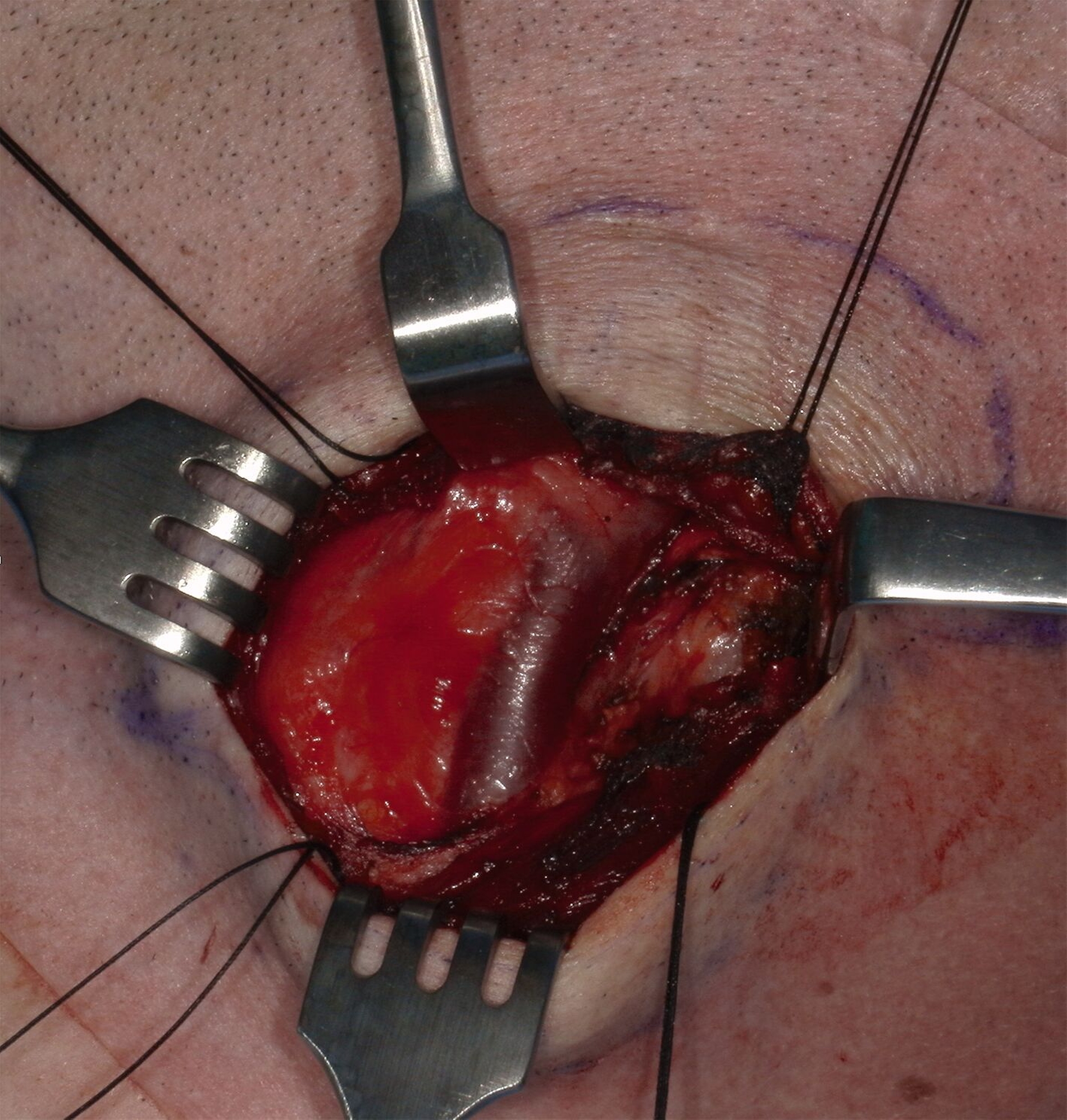 In Zusammenschau der Befunde und aufgrund einer deutlichen Größenprogredienz verständigten wir uns im Konsens mit dem Patienten auf eine Entfernung des Befunds. Die Operation erfolgte einige Wochen später in Intubationsnarkose. Dabei wurde über einen submandibulären Zugang der Befund zunächst unter Schonung der umgebenden Strukturen dargestellt. Bei Exploration des Situs zeigte sich die Raumforderung gut abgrenzbar in der linken Regio cervicalis anterior mit einer bindegewebigen Kapsel überzogen (Abbildung 5). Unmittelbar kaudal des Befunds konnten die großen Halsgefäße identifiziert werden (Abbildung 6).