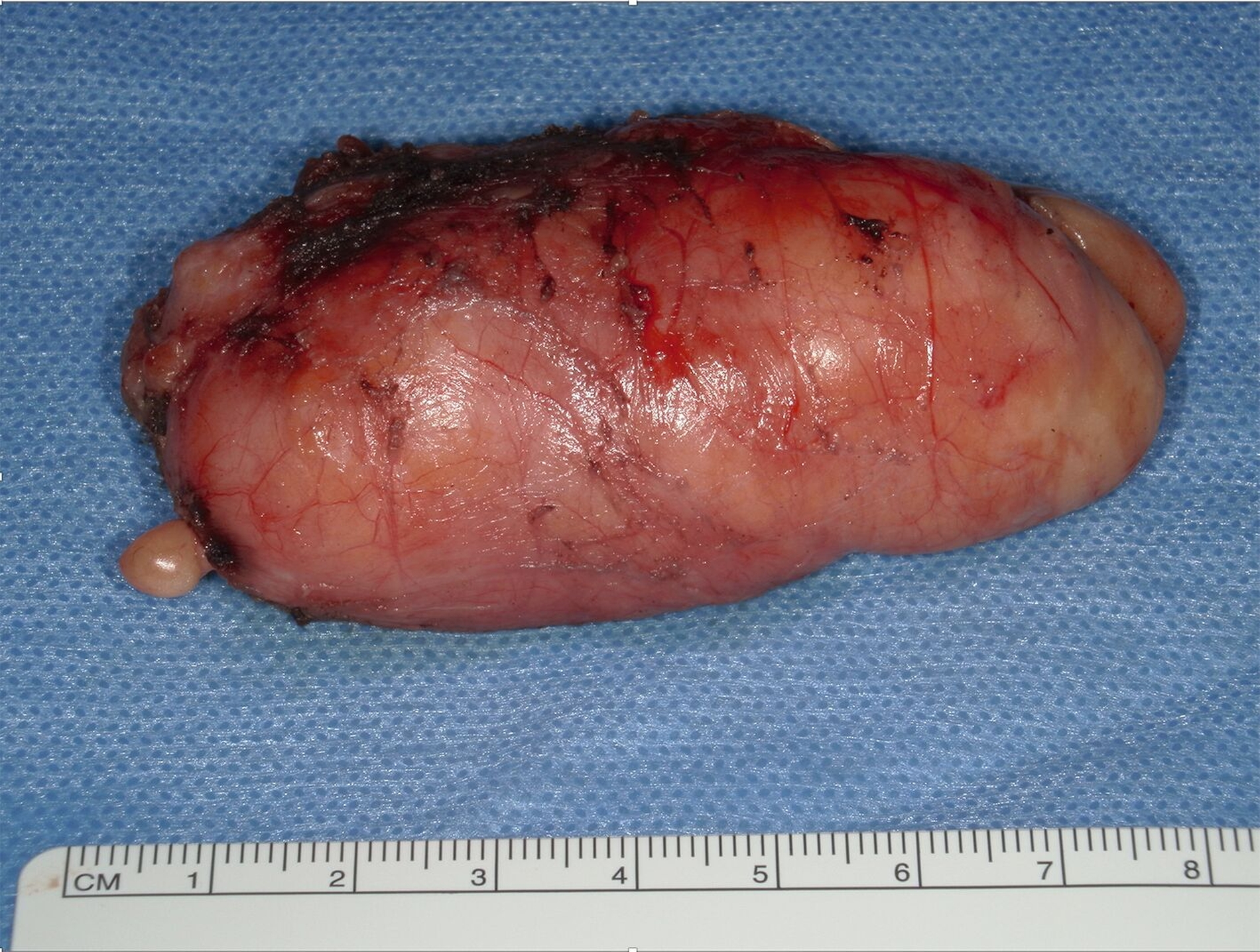 Nach vorsichtiger Präparation konnte die Raumforderung schließlich in toto entfernt und an die Pathologie gegeben werden (Abbildung 7). Eine Infiltration von Nachbarstrukturen durch den Befund war nach ausgedehnter Exploration des Op-Gebiets nicht ersichtlich. Abschließend wurde eine Redon-Drainage eingelegt und der Wundbereich mehrschichtig verschlossen.