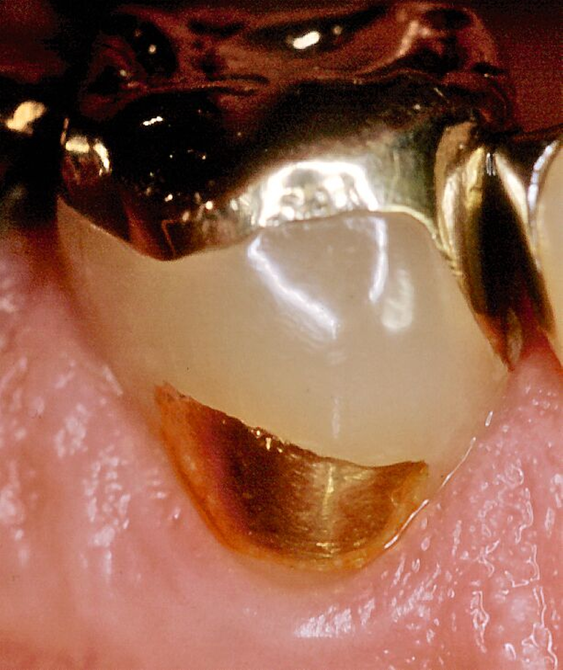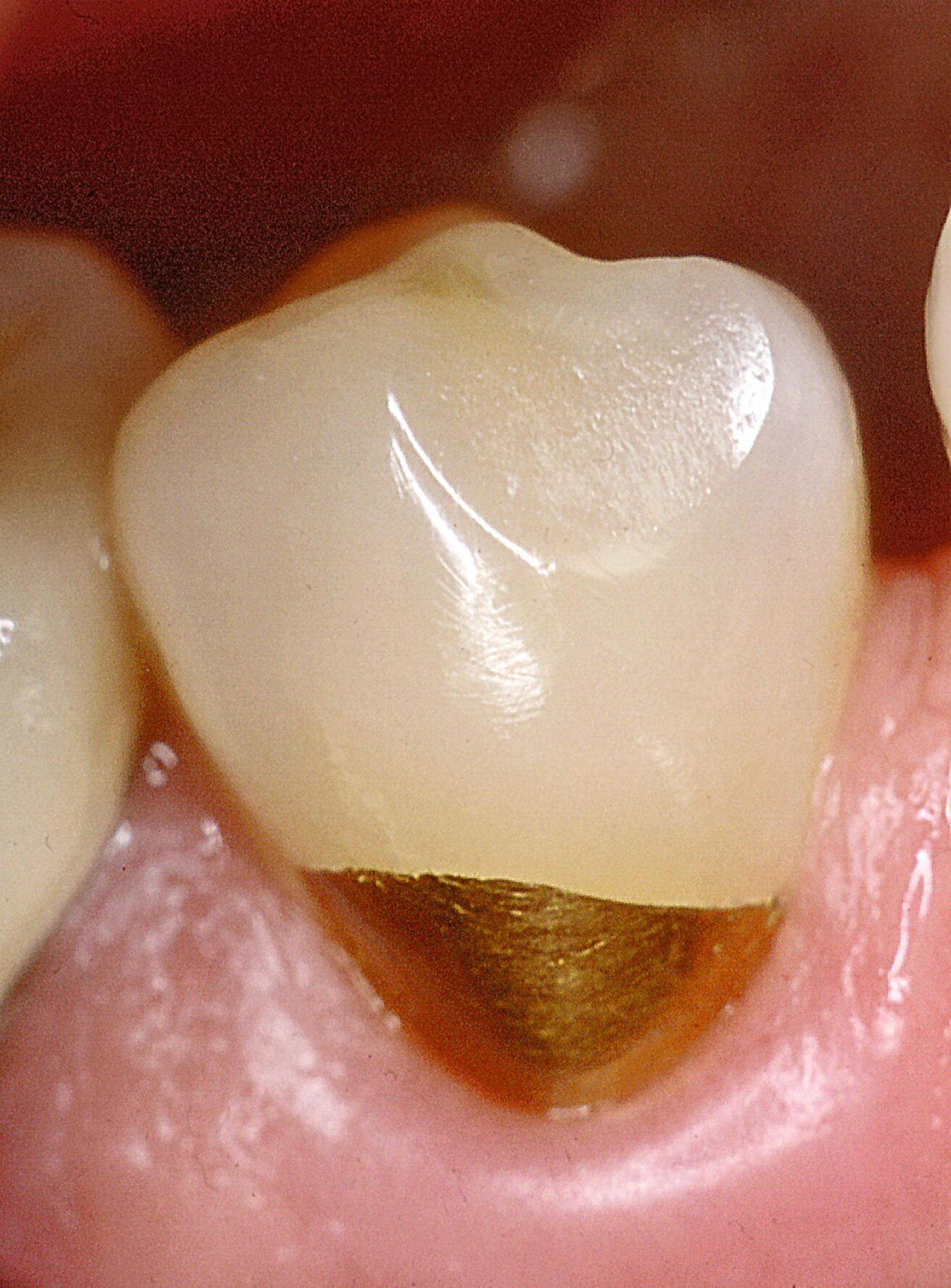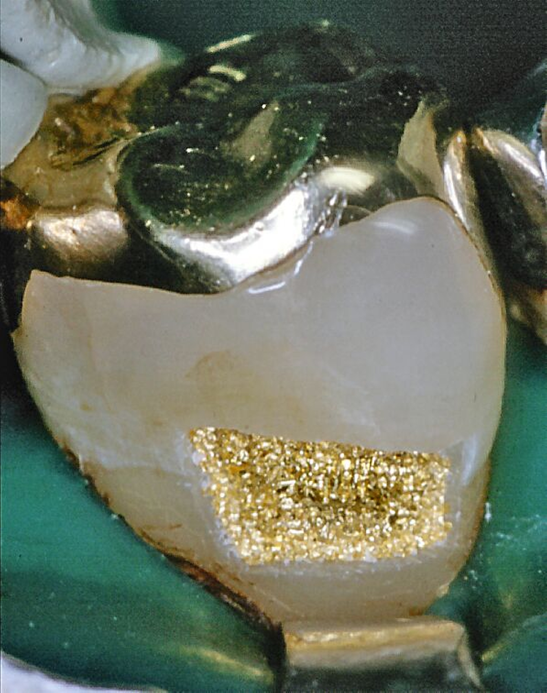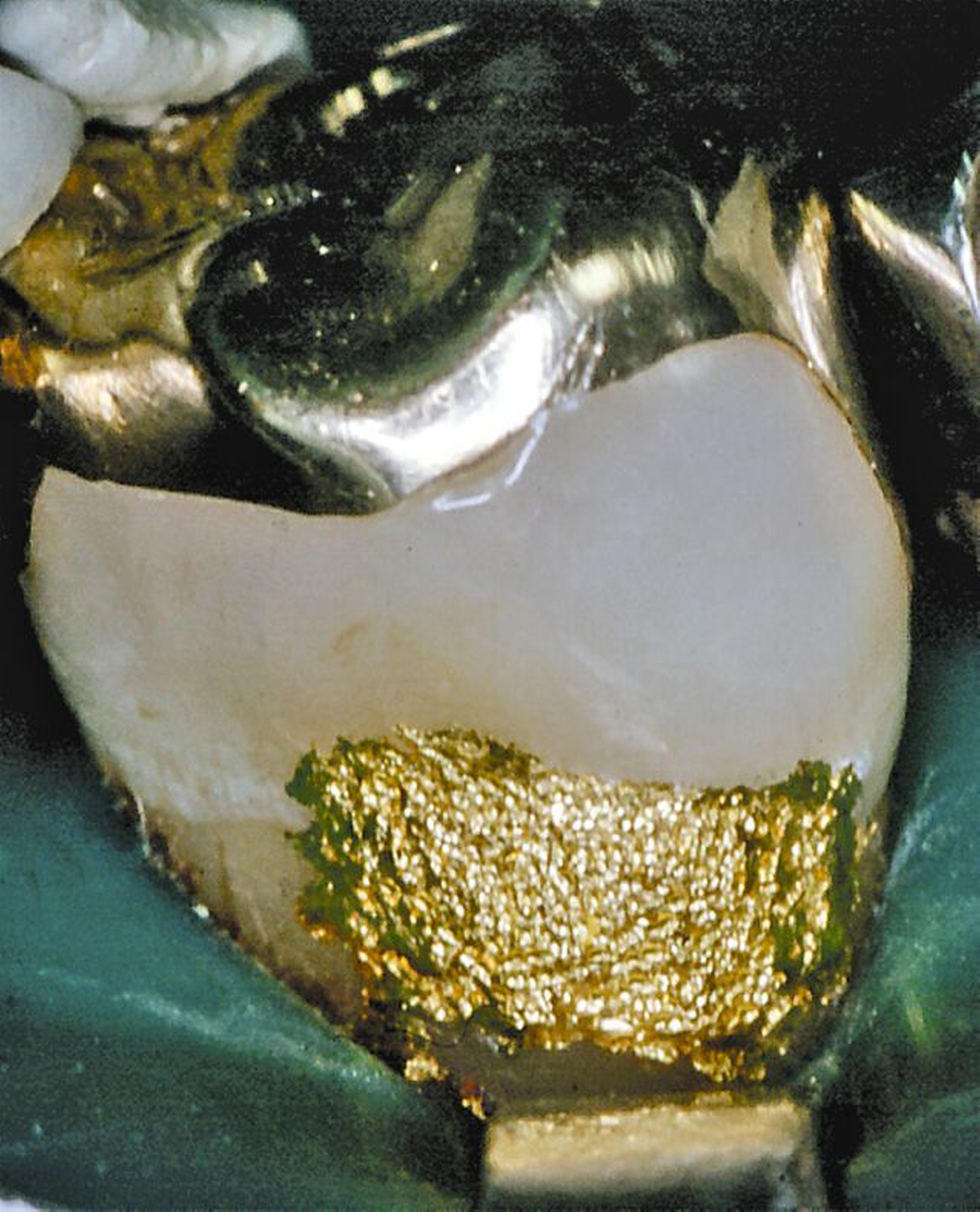 Eine Kontamination während der Kondensation führt zum sofortigen Misserfolg, da sich die einzelnen Goldlagen nicht mehr miteinander verbinden. Heute werden im Wesentlichen zwei Materialarten verwendet: die Goldfolie und das E-Z- oder auch Easy Gold (Loyd Baum Dental Center, Loma Linda, USA).
