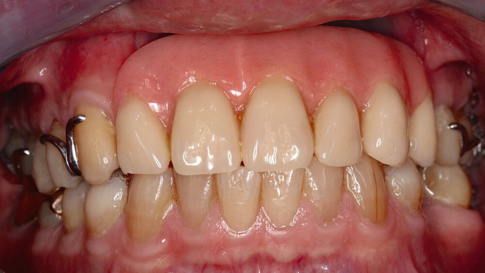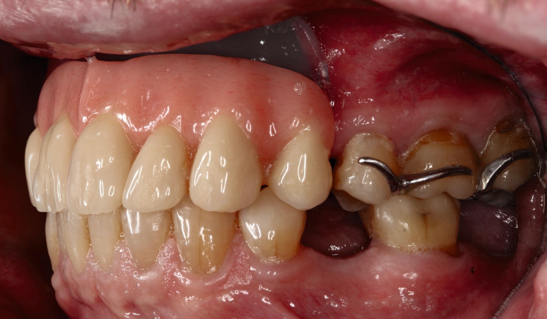 Bei einer Obturator-Prothese (Abbildung 2) erfolgt der Defektverschluss mittels hartem Acrylat-Prothesenkunststoff. Sie kann im Zenit offen oder geschlossen gestaltet sein. Der Halt wird über Klammern, Teleskope oder eine implantatgetragene Verankerung erzielt. Bei vollständiger Zahnlosigkeit ist eine Obturator-Prothese nicht zu empfehlen, da der gewöhnlich genutzte Saugeffekt nicht hergestellt werden kann. Bei zahnlosen Patienten, die keine Implantate erhalten können oder sollen, ist es sogar empfehlenswert, den Defekt nicht zu rekonstruieren, damit Unterschnitte für einen Silikon-Obturator genutzt werden können.