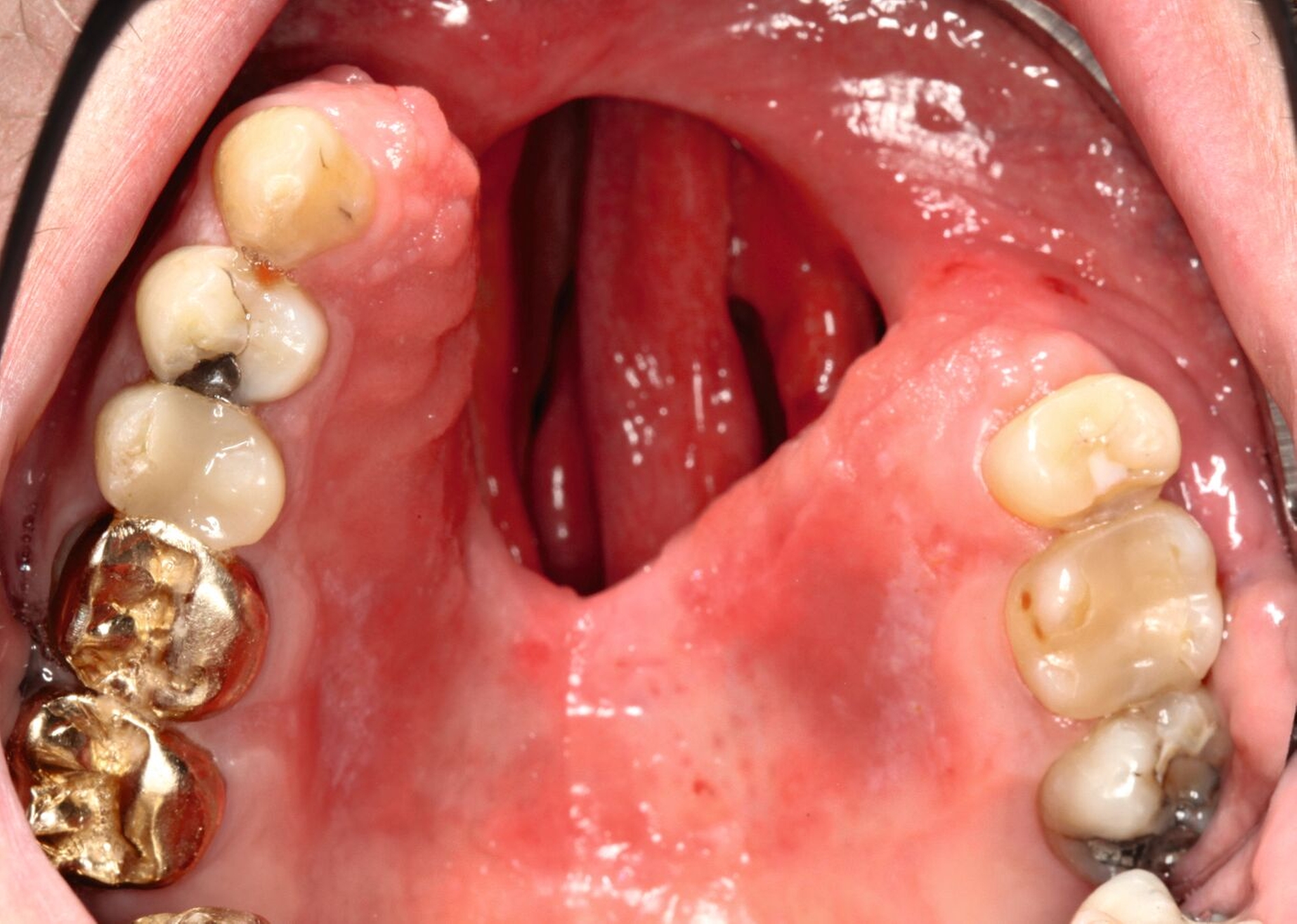 Bei der Tumornachsorge zeigt sich ein großer Vorteil des prothetischen Defektverschlusses: Zusätzlich zur Bildgebung kann mithilfe klinischer Inspektion frühzeitig ein Rezidiv entdeckt werden [Ali et al., 1995; Moreno et al., 2010]. Beim prothetischen Defektverschluss kann eine Acrylat-Obturator-Prothese gewählt werden, die je nach Mundöffnung ein- oder mehrteilig gestaltet ist und die auch verlorengegangene Zähne ersetzt. Alternativ gibt es die zwingend zweiteilige Möglichkeit eines Defektverschlusses über einen Silikon-Obturator mit einer darauf sitzenden Prothese zum Ersatz von Zähnen.
