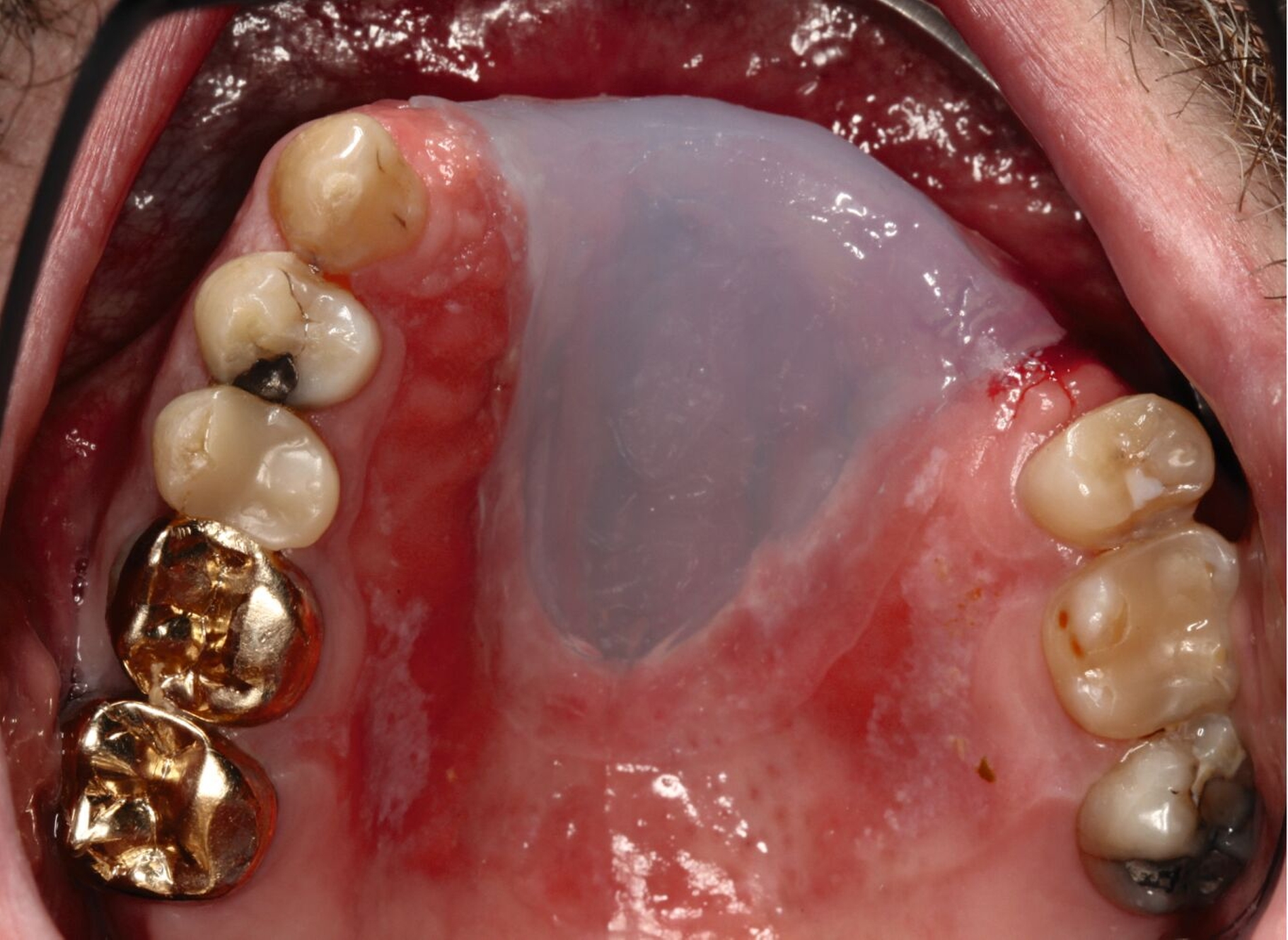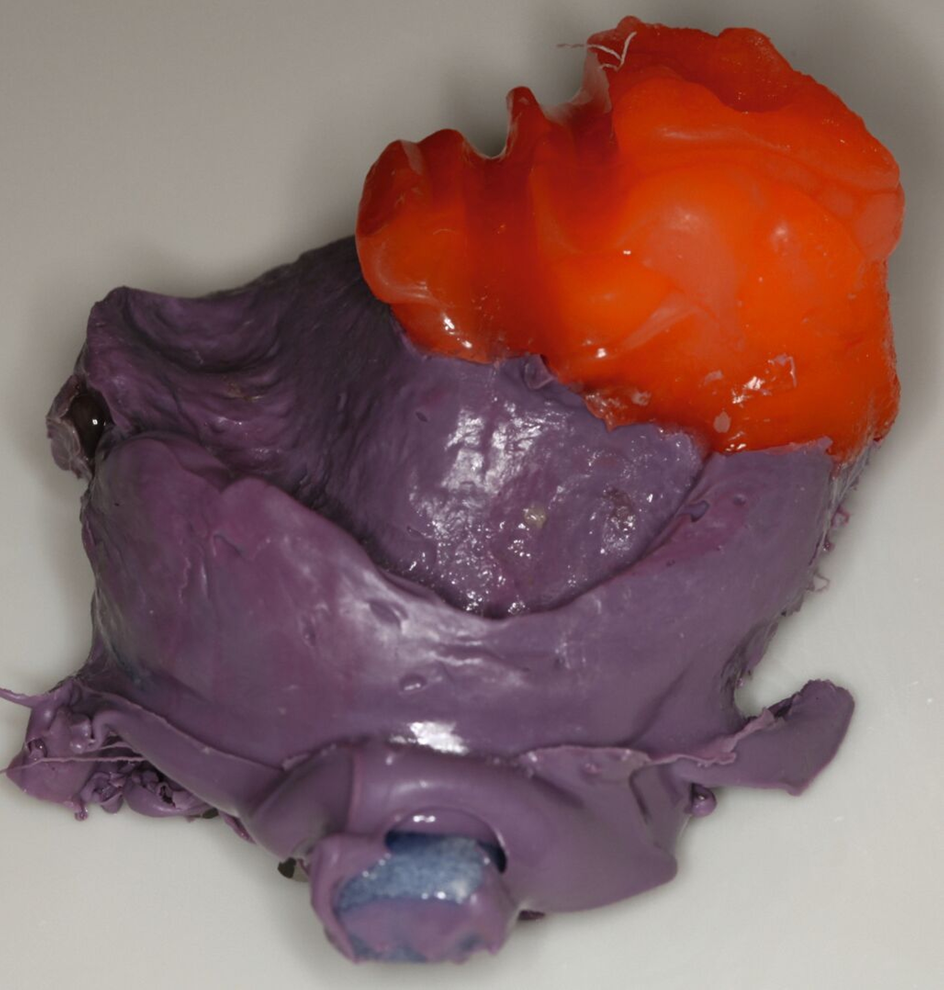 Mit Einbringen eines Wendel-Tubus zur Sicherung der Atemwege, lässt sich der Defekt ohne Probleme abformen (Abbildung 3). Jener verhindert auch, dass der spätere Silikon-Obturator die Atemwege nicht verlegt. Speziell visköses Silikon-Abformmaterial („Laborsilikon Orange“, 12 Shore A, Institut für Anaplastologie Schilling, Würzburg, Deutschland) verhindert ebenfalls, dass die Abformmasse in Richtung des Pharynx fließt. Nach der Defektabformung können die herkömmlichen Arbeitsschritte für einen Zahnersatz (als Zusatz zum Silikon-Obturator oder zur Herstellung einer Obturator-Prothese) erfolgen.