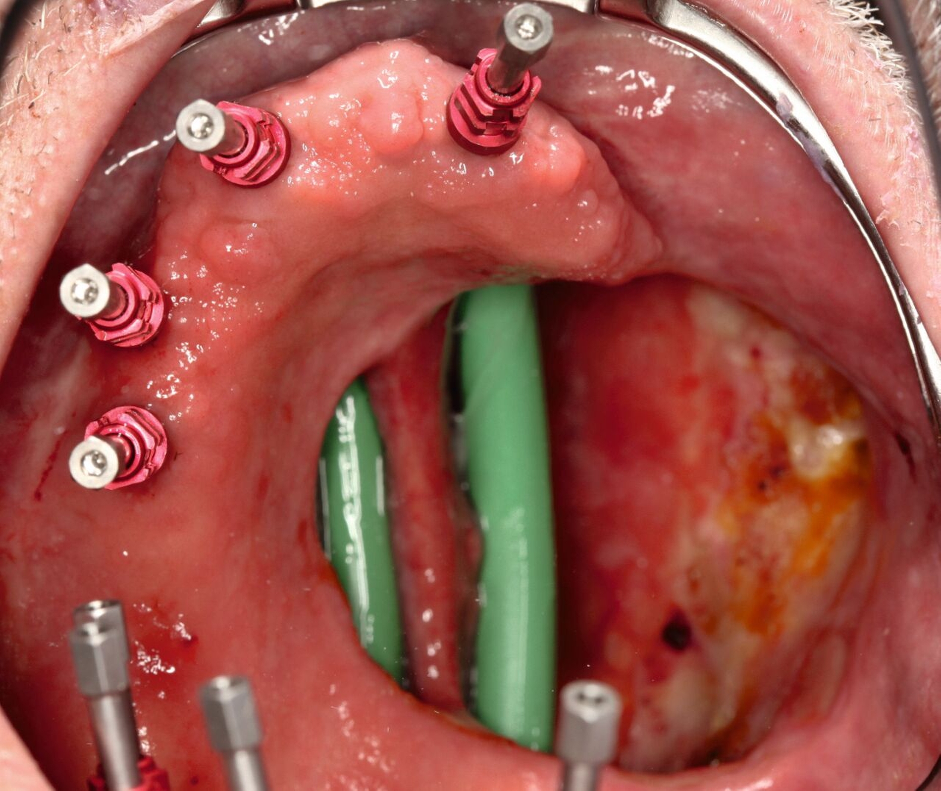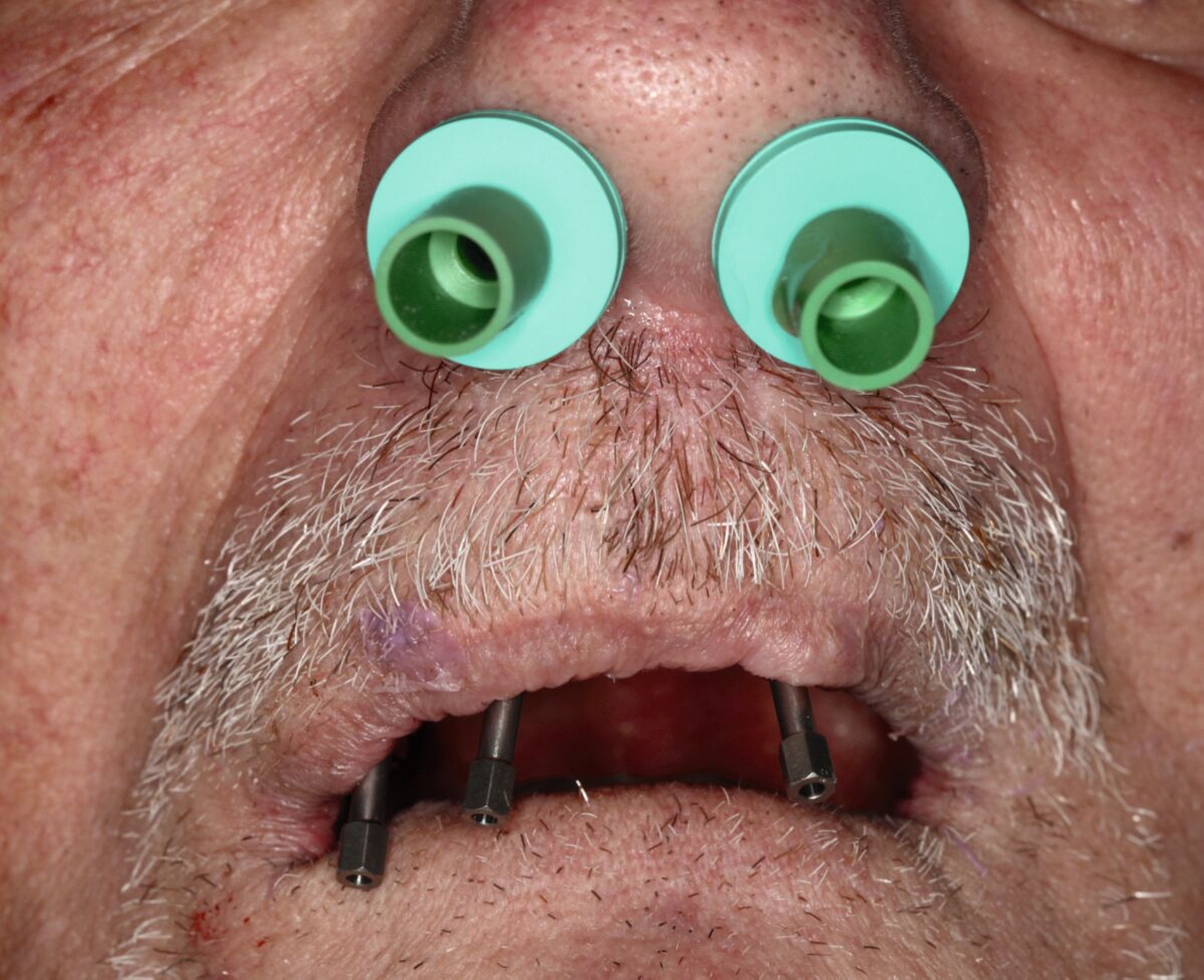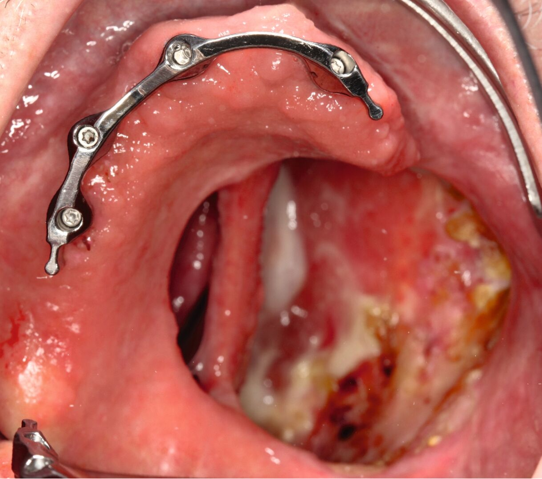 Wenn möglich und vom Patienten gewünscht, wird eine chirurgische Rekonstruktion gewählt. Hier wird beispielsweise mit mikrovaskulär anastomosierten Fibula- oder Beckenkammtransplantaten nach erfolgter Oberkiefer(teil-)resektion der vollständige Verschluss der oro-nasalen Verbindung angestrebt [Dos Santos et al., 2018]. Durch den Verschluss wird die Sprechfunktion wiederhergestellt. Die knöcherne Rekonstruktion ermöglicht die Insertion von Implantaten in den knöchernen Anteil des Transplantats [Wijbenga et al., 2016], wodurch die Möglichkeit für einen implantatgetragenen Zahnersatz geschaffen wird.