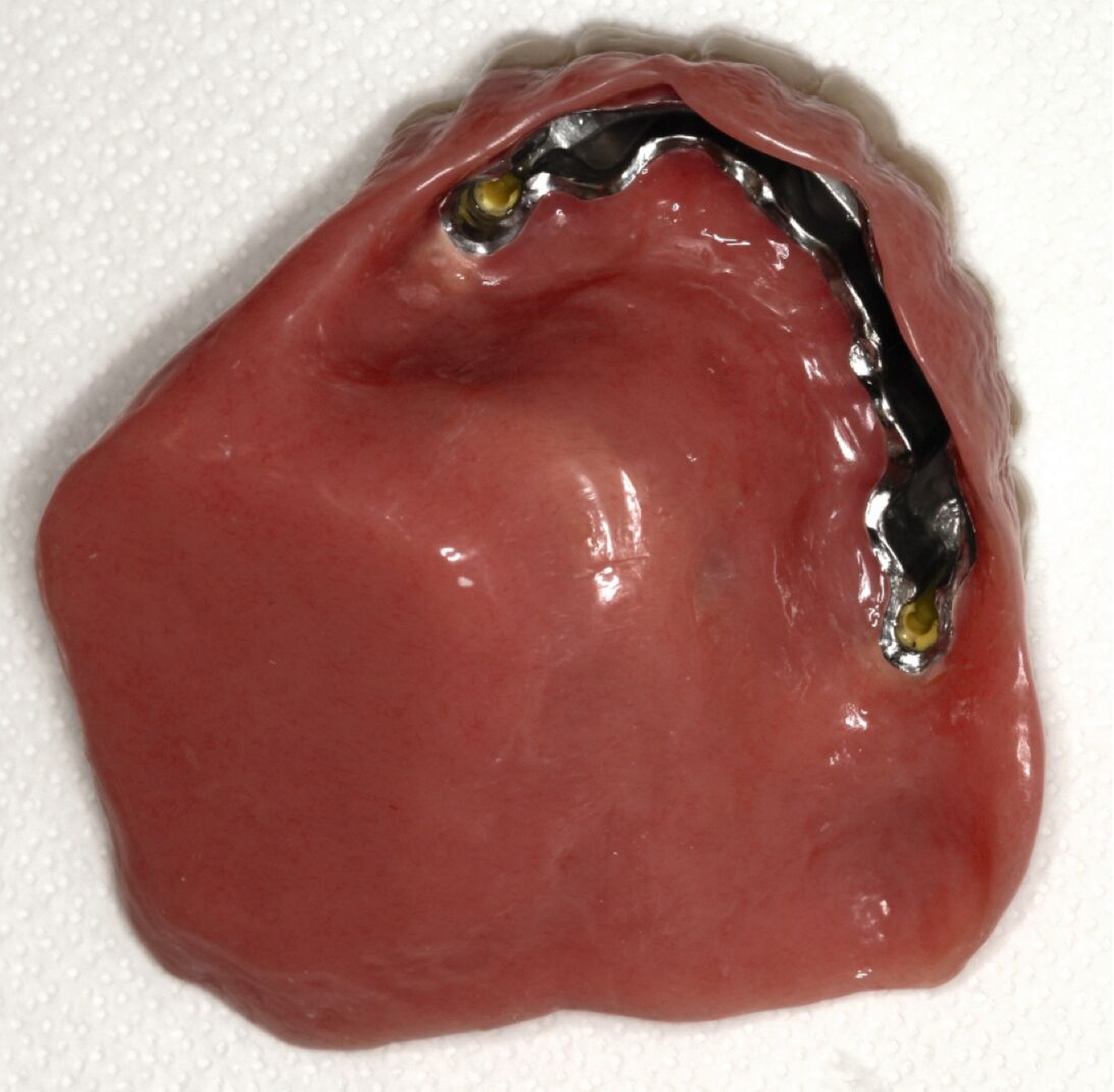 Ein Silikon-Obturator (Abbildung 1) wird über „unter-sich-gehende“ Bereiche im Defekt verankert, kann hohl oder massiv gestaltet sein und sollte im Mund über einen fein auslaufenden Rand (Federrand) am restlichen Weichgewebe enden. Durch diesen feinen Rand ist die Abdichtung zur Nase wie mit einem Saugstopfen sehr gut. Bei fehlendem Vestibulum ist ein fein auslaufender Rand technisch nicht möglich, weshalb durch einen Silikon-Obturator hier nur in seltenen Fällen ein zufriedenstellender Halt erreicht wird. Optimalerweise sollte der Silikon-Obturator täglich vom Patienten entfernt und gereinigt werden können, um die Ansiedlung von Pilzen zu vermeiden.