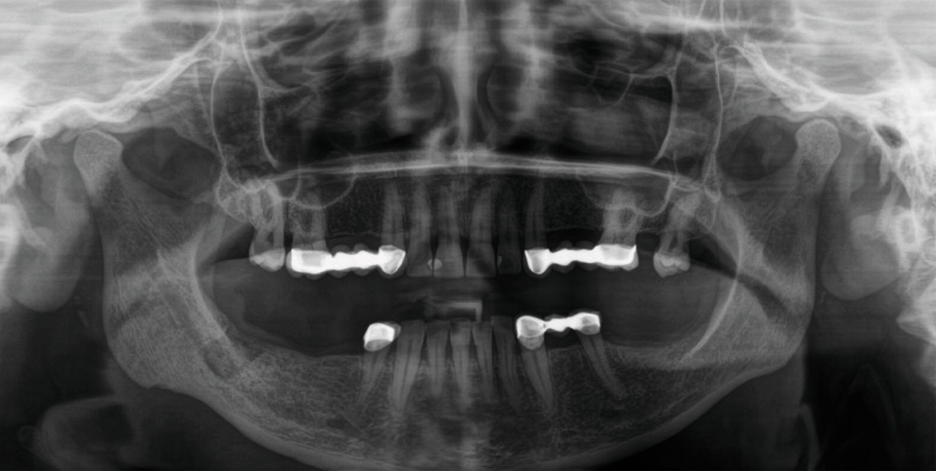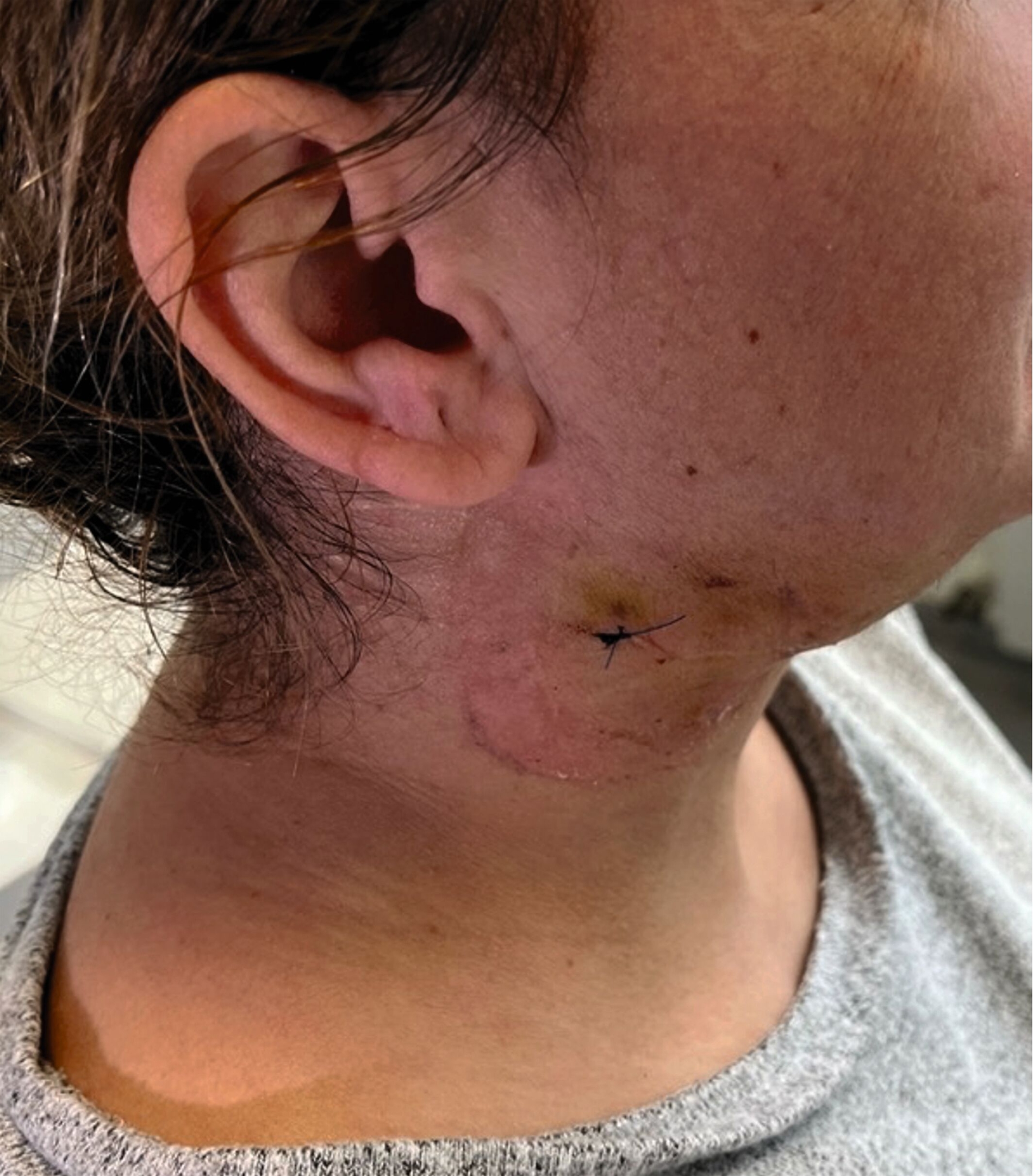 In der klinischen Untersuchung zeigte sich der submandibuläre Volumendefekt rechts im Bereich der alten Narbe der Submandibulektomie. Zusätzlich zeigte sich zum Untersuchungszeitpunkt submandibulär rechts ein Fistelmaul. Die Haut im Bereich des alten OP-Gebietes war narbig und derb strukturiert und teilweise mit dem subkutanen Gewebe verbacken. Die Sensibilität zeigte mit Ausnahme des Bereiches der alten Operationsnarbe eine Normästhesie, die lokale Gewebeperfusion erschien soweit klinisch beurteilbar unauffällig. Die Funktion des N. facialis war bis auf eine leichte iatrogene Schädigung des N. marginalis und damit eines gering hängenden rechten Mundwinkels regelgerecht. Die Patientin hatte keine Schmerzen im Bereich des Volumendefekts, die Beweglichkeit des Halses war uneingeschränkt. Im Zuge der intraoralen Untersuchung und der begleitenden zahnärztlichen Bildgebung zeigte sich ein nicht erhaltungswürdiger Zahn 48 mit einer apikalen Entzündung, der gemeinsam mit der nach extraoral reichenden Fistel und dem extraoral gelegenen Fistelmaul entfernt wurde (Abbildung 2).